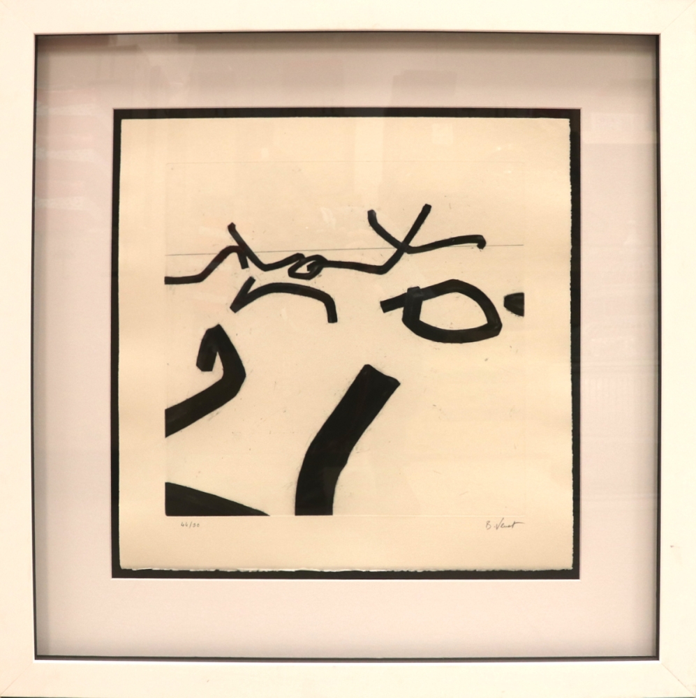 Ets van Benar Venet getekend en genummerd op 90 exemplaren. Het werk is mooi ingelijst in een witte dikke lijst met achterliggend een zwarte passe-partout. Het werk en de lijst zijn in goede staat. Bernar Venet (1941), geboren in Frankrijk maar sinds 1966 wonende in New York City is een vooraanstaande, internationale beeldhouwer. Venets staalsculpturen zijn in veel internationale museum- en privécollecties opgenomen, maar ook op veel plaatsen in de openbare ruimte vertegenwoordigd, met name zijn sculpturen in cortenstaal Lignes indéterminées, onder andere in Keulen (1999), Parijs (2002), Nice, Luxemburg (2003) en New York City (2004).
