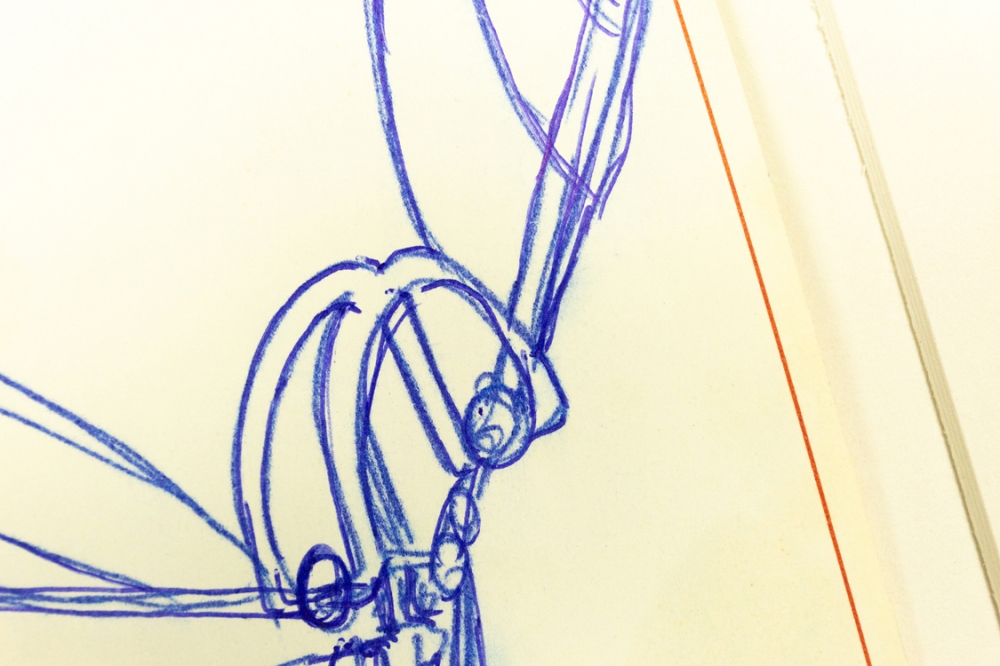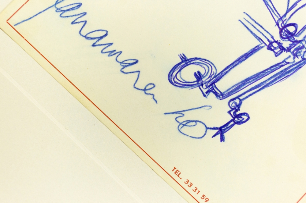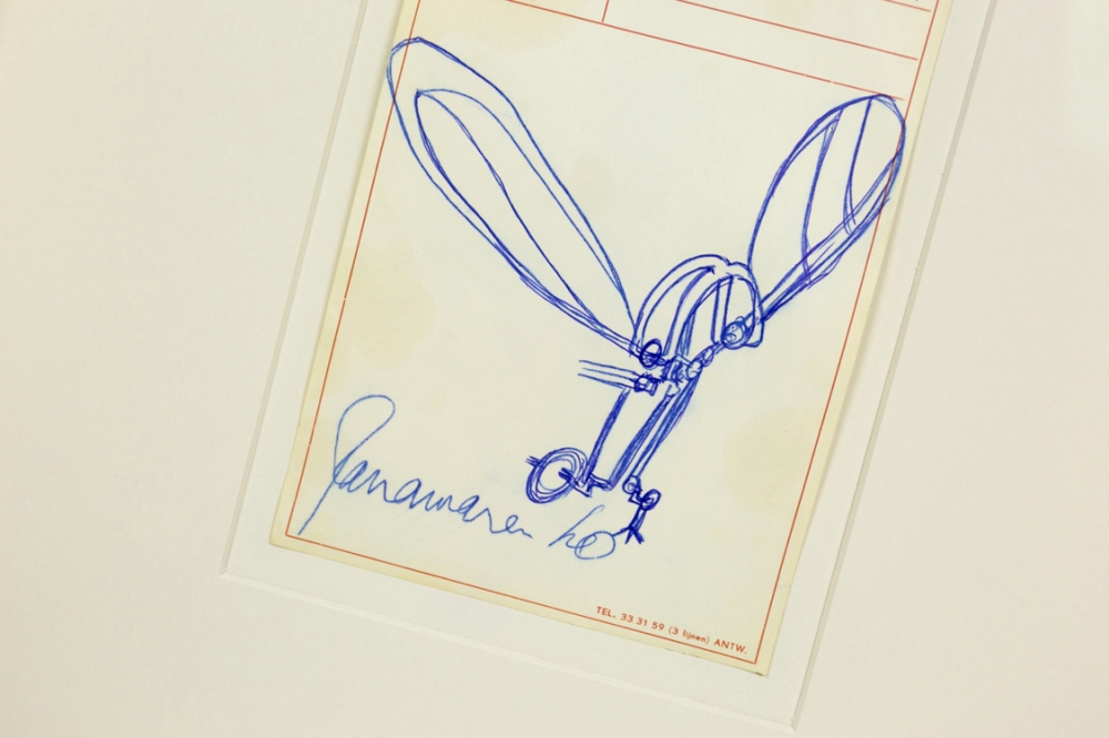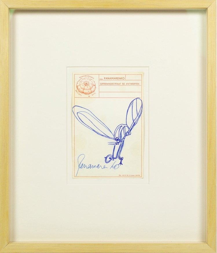 Prachtig en uniek werk van Panamarenko. Een originele pentekening op briefpapier van Panamarenko. De tekening geeft een studie weer van zijn werk Umbilly. De tekening is onderaan gesigneerd. Zeer mooi ingelijst en in perfecte staat.