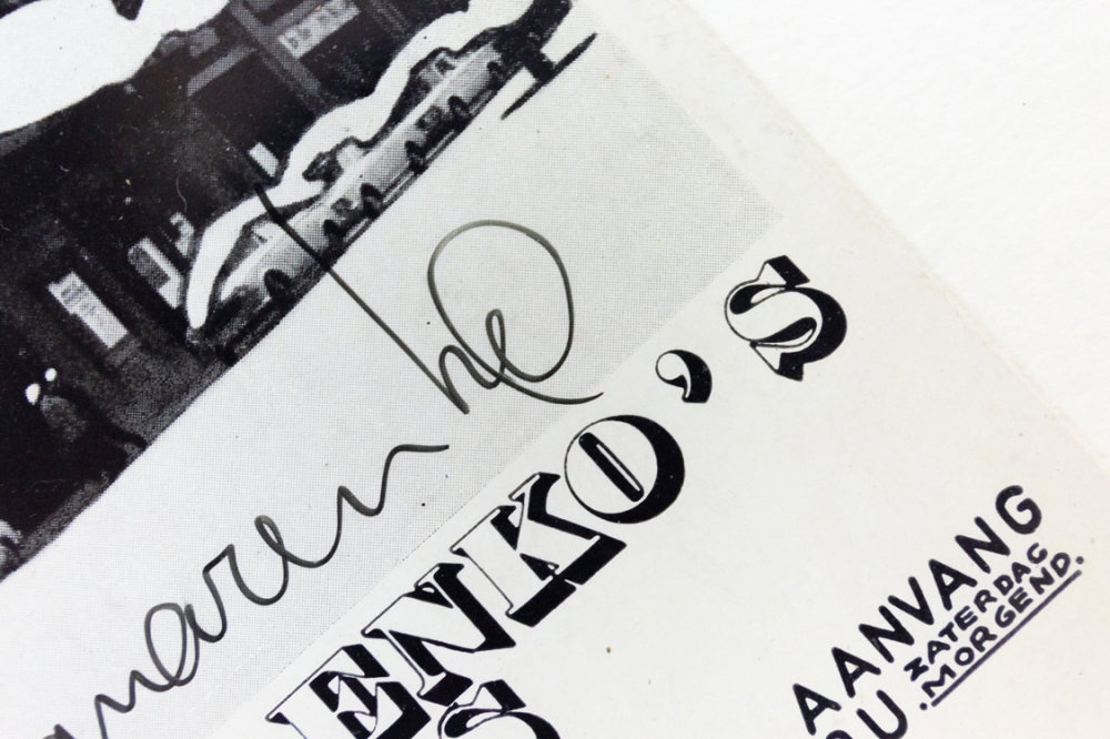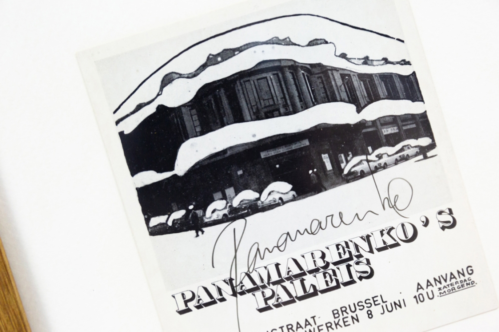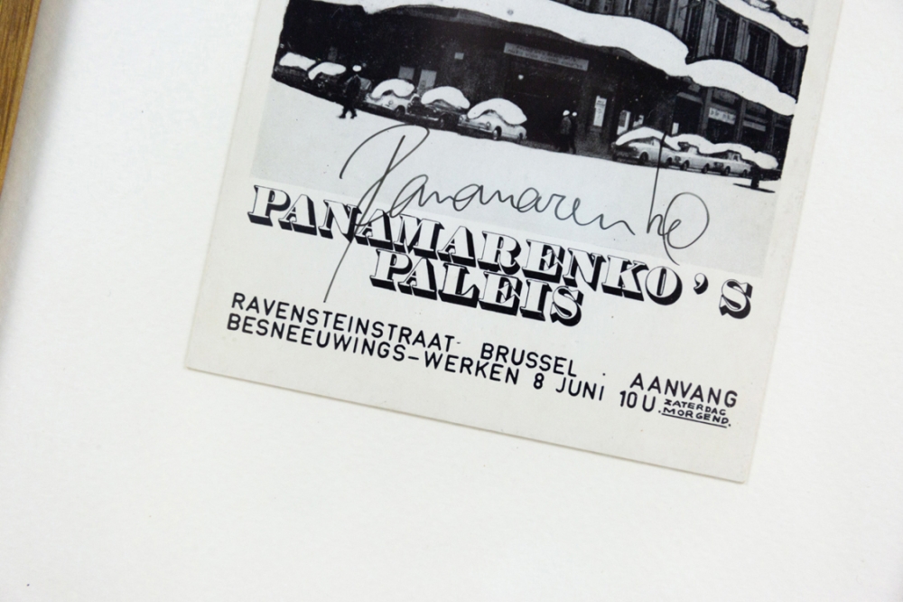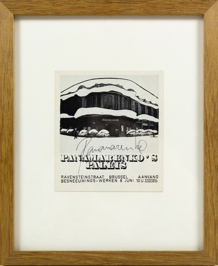 Dit is een uitnodigingskaart voor Panamarenko’s Paleis. Panamarenko zou echter nooit de toelating krijgen het te laten doorgaan waardoor dit kaartje het enige is wat er van overblijft. In perfecte staat en met de hand gesigneerd.