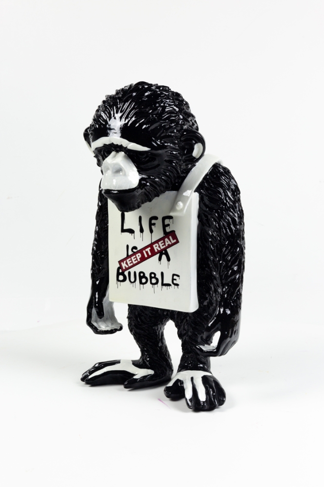 Sculptuur uit kunsthars van Diederik Van Apple. Deze 'street monkeys' zijn met de hand beschilderd en voorzien van een gedrukt opschrift. De oplage is gelimiteerd tot 250 stuks.