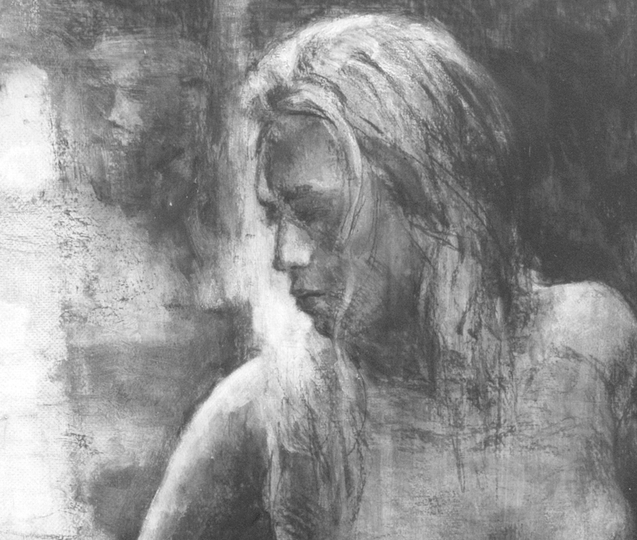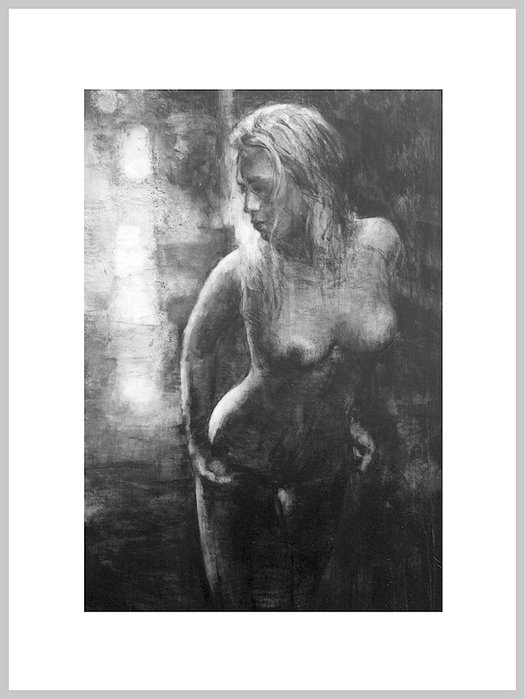 Dit werk is een gemengde techniek van houtskool en verf op papier. Ingelijst in een hoge kwaliteit aluminium lijst achter glas. afmeting lijst: 120 x 90 cm. afmeting beeld ca 90 x 60 cm. Het onderwerp is een naakt in tegenlicht op een regenachtige dag. Het werk is op een aantal exposities geëxposeerd geweest en heeft altijd een hoop positieve aandacht gekregen. Lambert Oostrum is nog steeds actief als beeldend kunstenaar. In het begin van zijn loopbaan heeft hij in 1987 de Alfons Blomme prijs gewonnen. Recent werkt Lambert meer abstract met af en toe wat figuratie. In 2018 is hij genomineerd voor de Herman Krikhaarprijs in Almelo . Het een en ander is te lezen op zijn website: www.lambertoostrum.nl