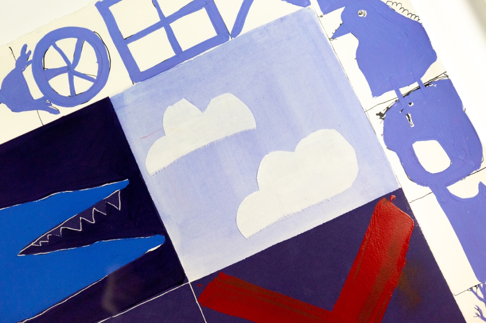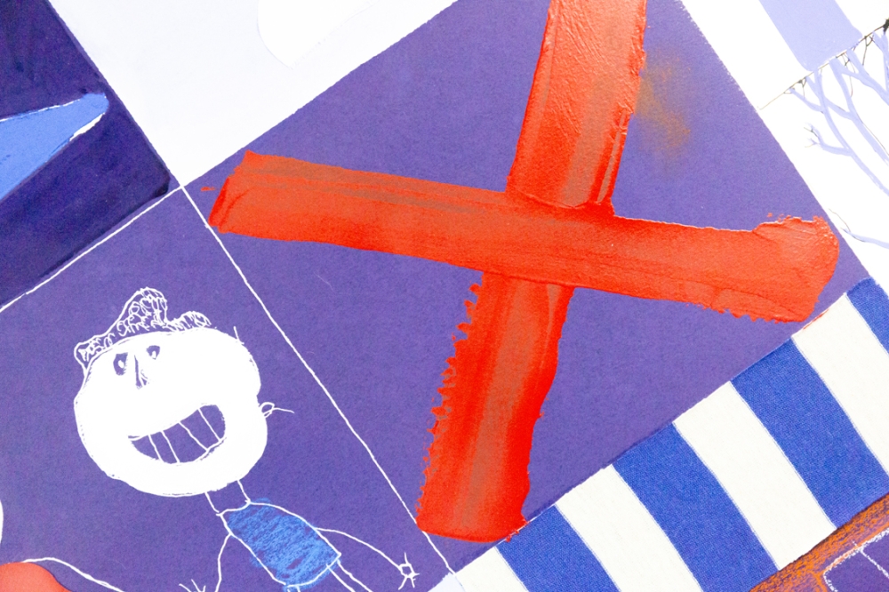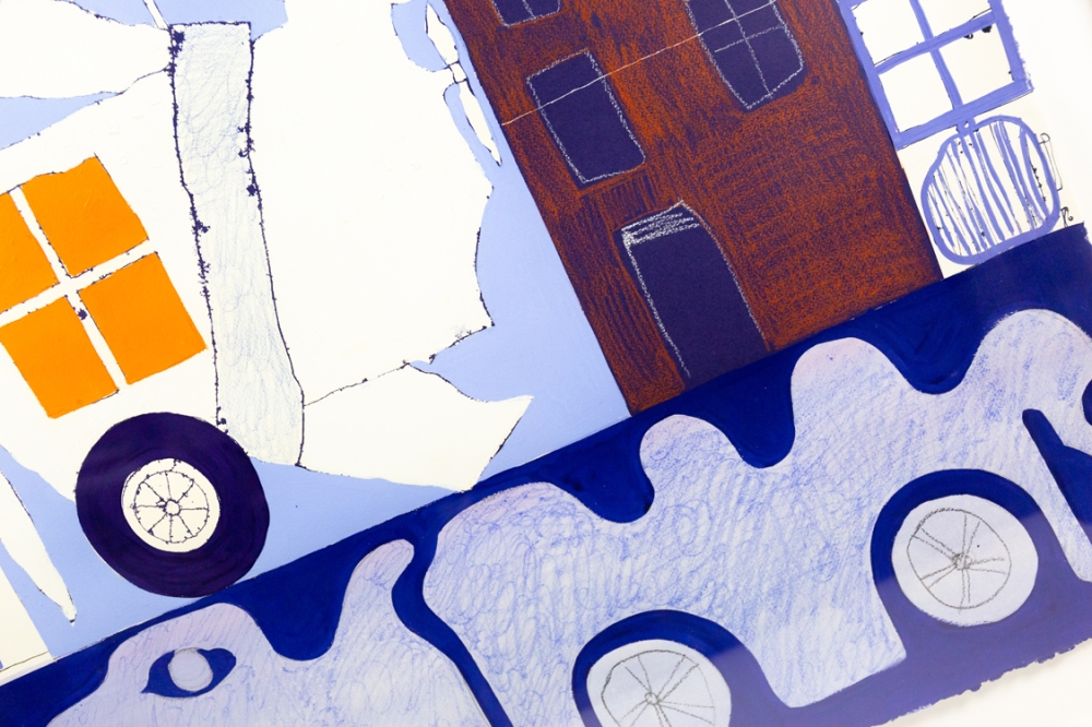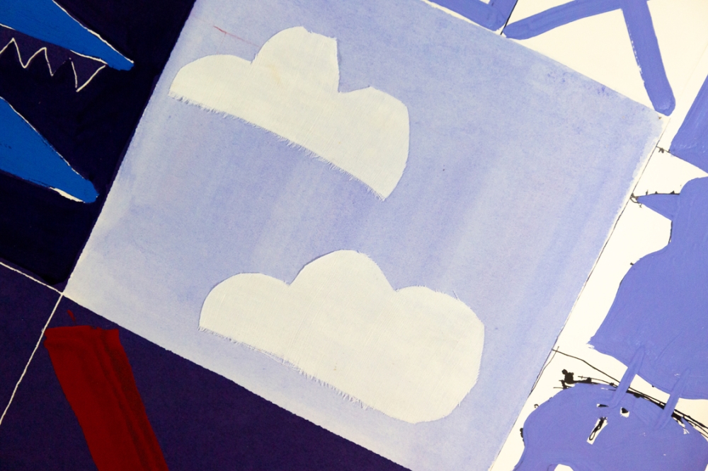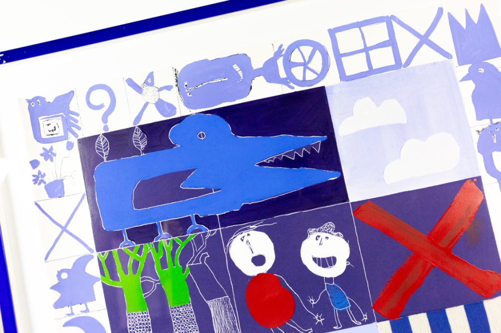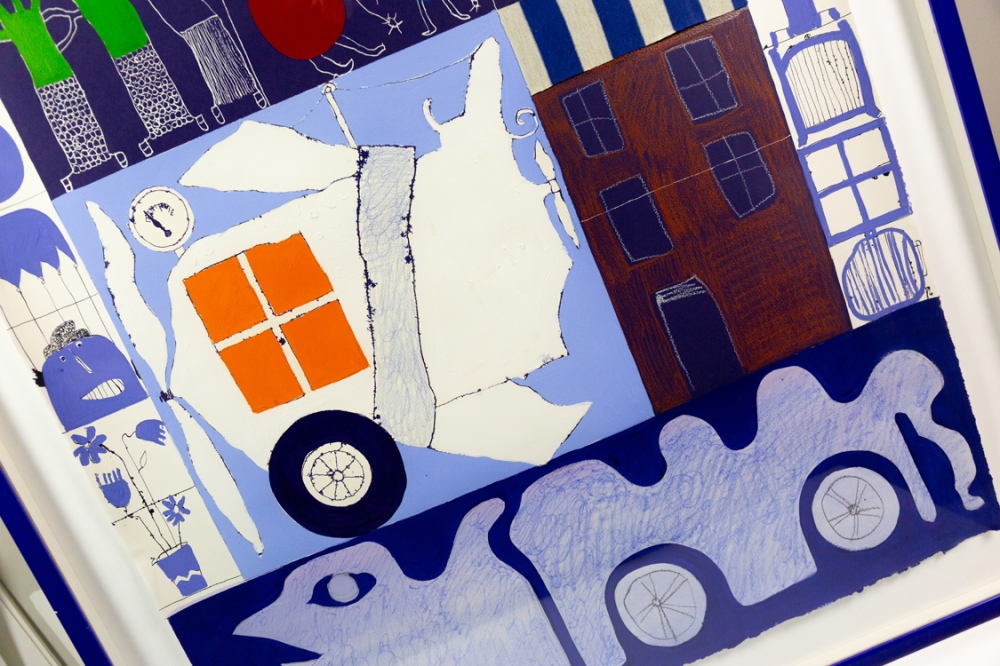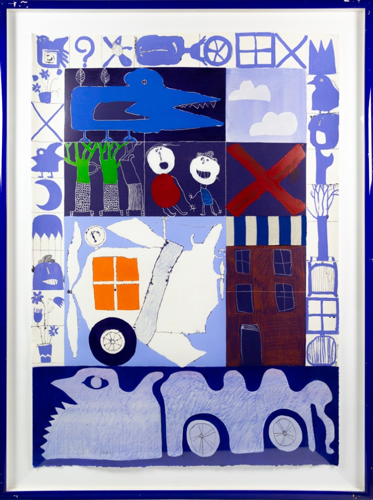 Mixed media schilderij (acrylverf en collage) van Christian Silvain op papier. Het unieke collagewerk werd ingekleurd met acrylverf en aangevuld met hier en daar een stukje stof. Het werk verkeert in uitstekende staat. Het kader heeft alhoewel de perfecte kleur wel wat gebruikkssporen.