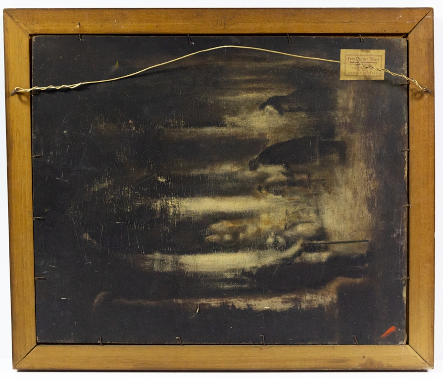 Het werk is ingelijst, de lijst heeft wat kromgetrokken gebruikssporen.
