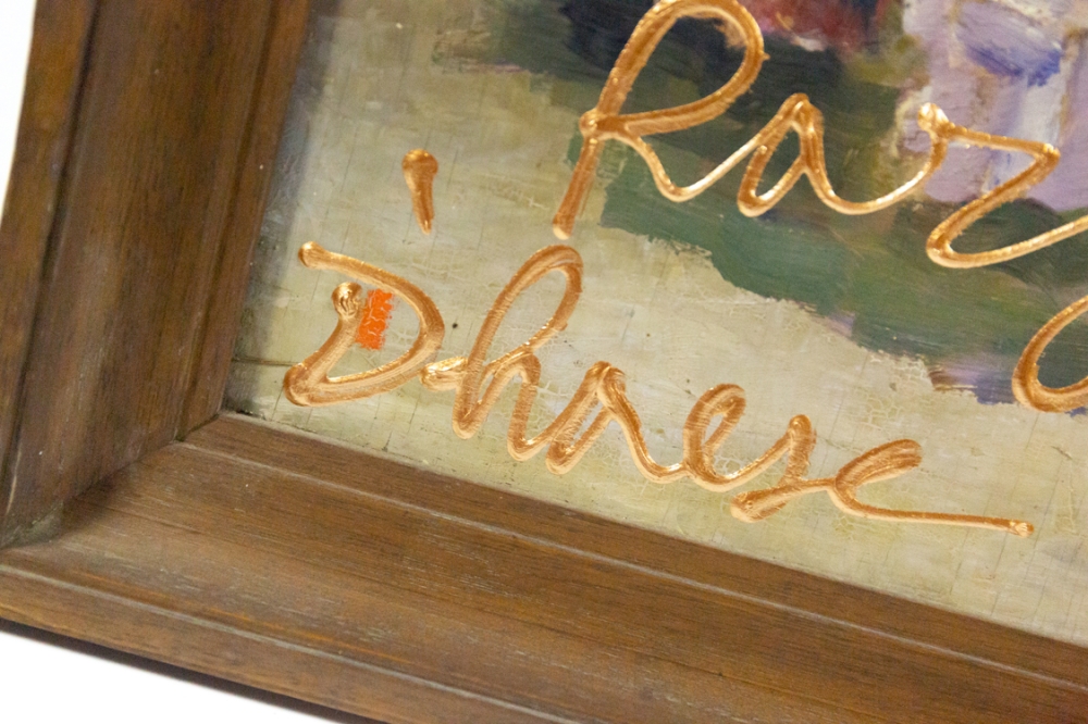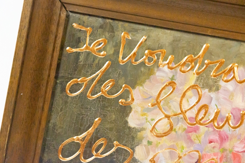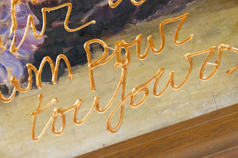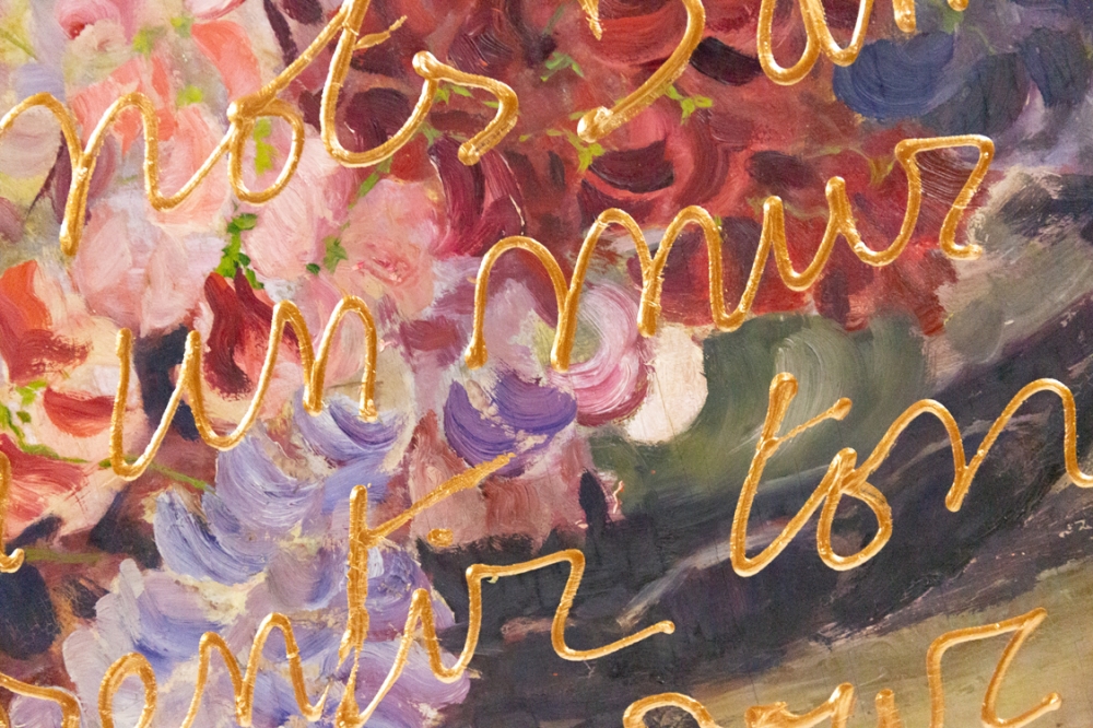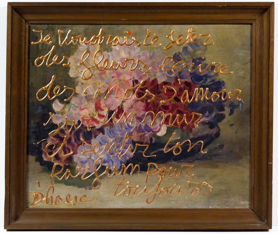 Schilderen met acrylverf door Hannes D'haese. Op een 'vermoedelijk' ouder werk staat de inscriptie "Je voudrais te jeter des fleurs, écrire des mots d'amour sur un mur et sentir ton parfum pour toujours" in goudkleurige acrylverf.