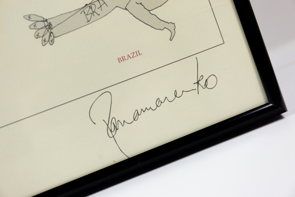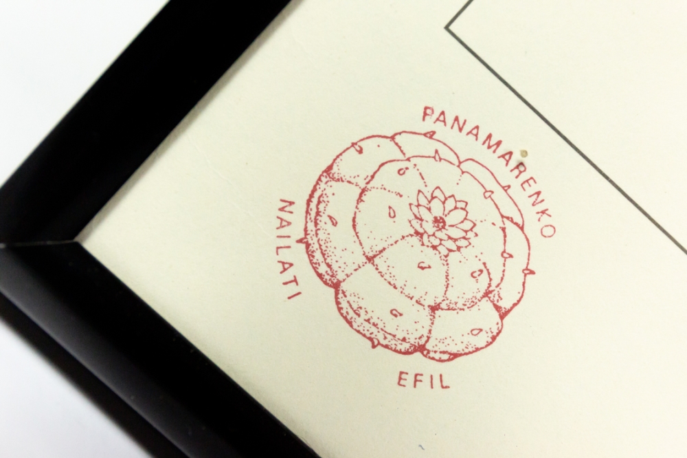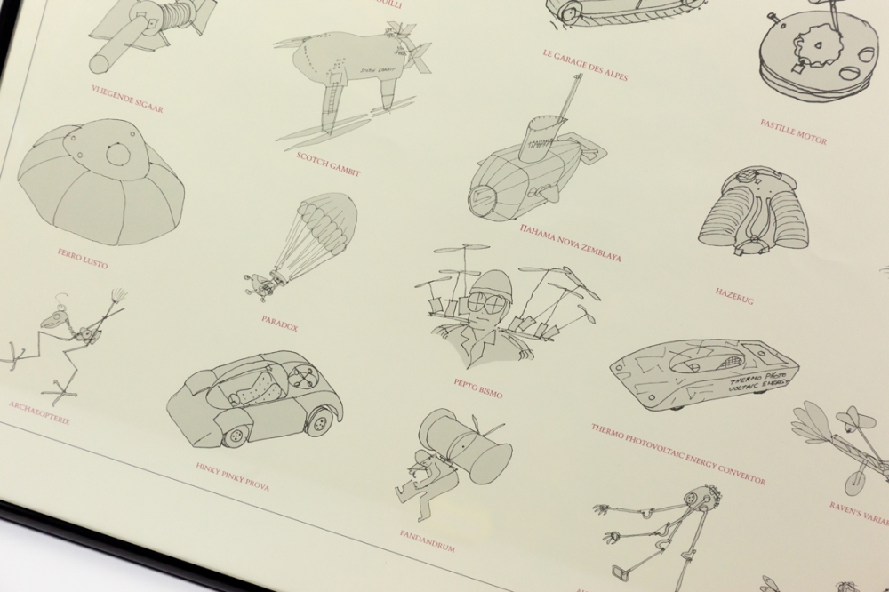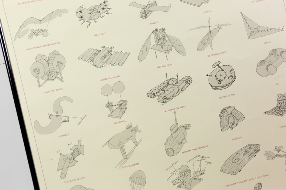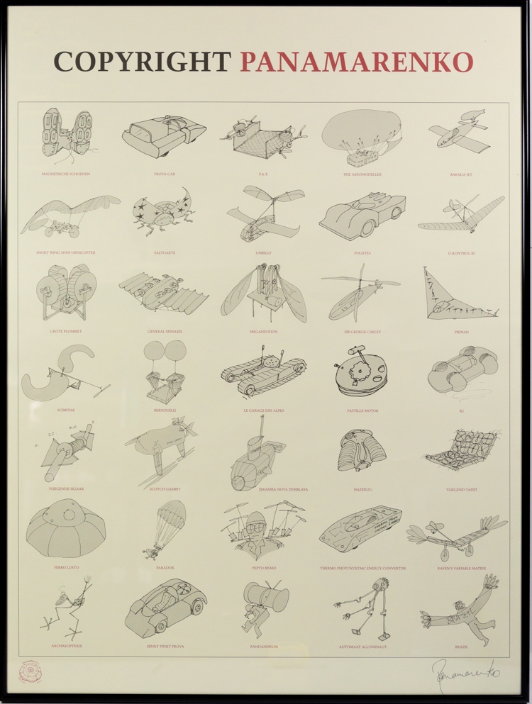 Offset poster "Copyright Panamarenko" waarop een groot aantal uitvindingen van Panamarenko in zijn gekende tekenstijl worden voorgesteld. De handtekening is gedrukt.