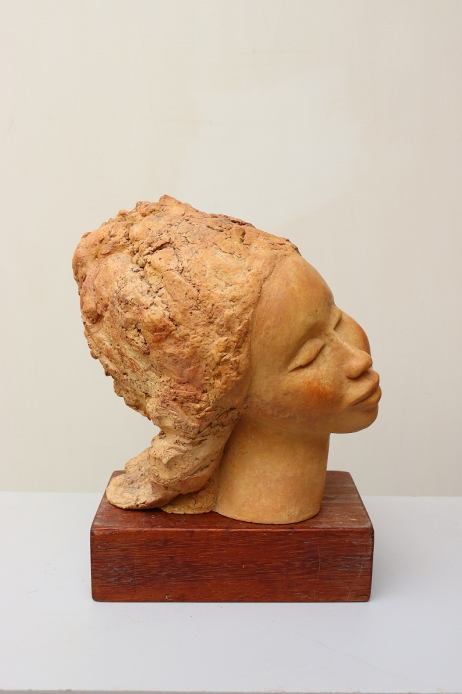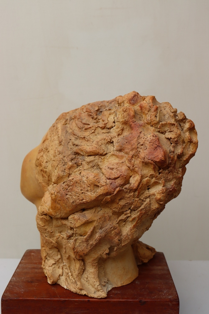 Sculptuur uit gepolijst steengoed, met een gewicht van 5kg. Het werk is geschikt om buiten te plaatsen.