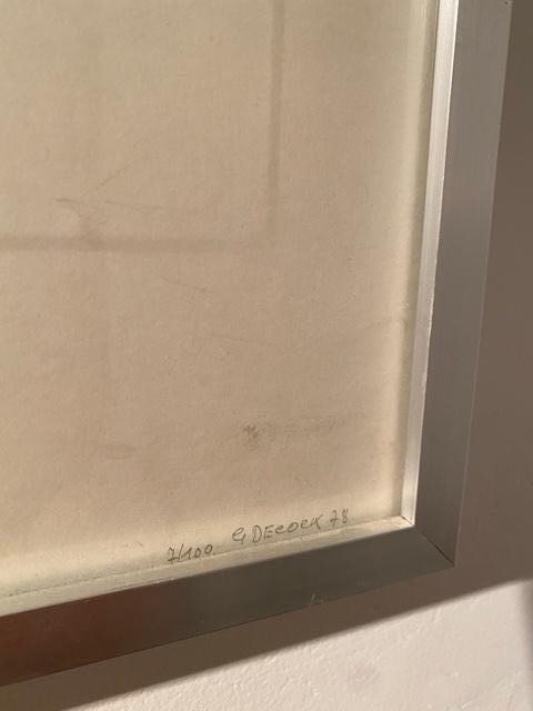 Zeer mooi werk van de Belgische kunstenaar Gilbert Decock. Dit betreft een zeefdruk uit 1978. Het werk is rechtsonder gesigneerd met de hand en linksonder genummerd op 100 exemplaren waarvan dit het nummer 7 is. Ingelijst in een aluminium lijst.