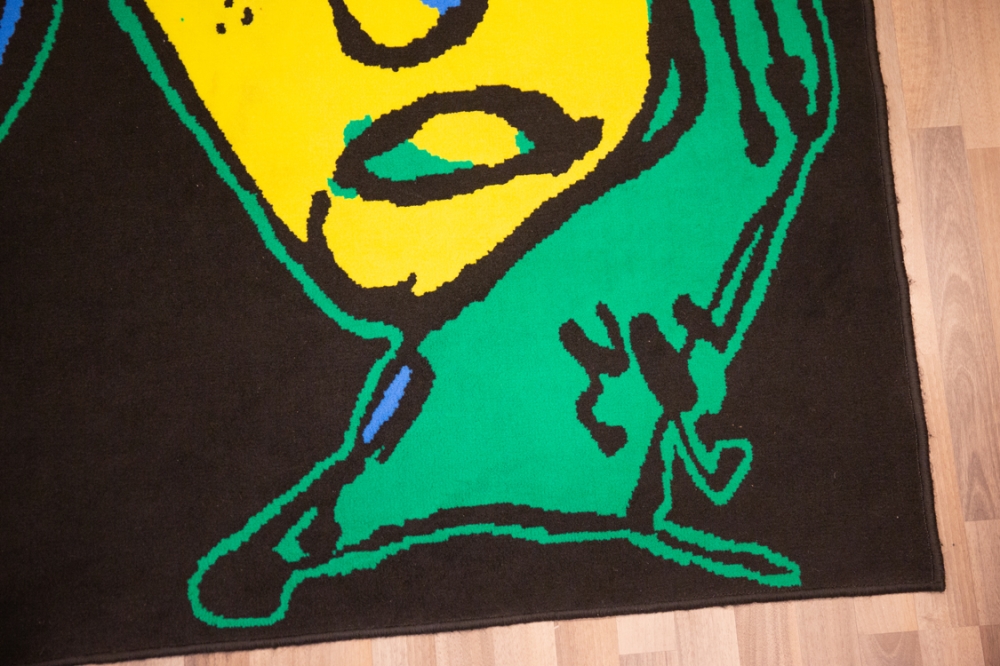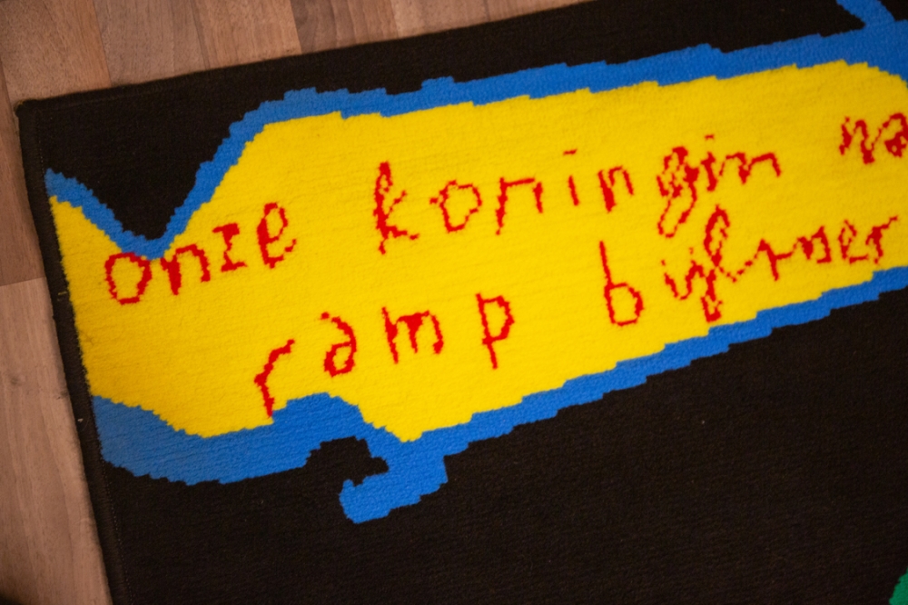 Tapijt met een afbeelding van Herman Brood, getiteld "Onze koningin na ramp Bijlmer". Afmeting 183cm x 137cm. Conditie: goede staat met lichte gebruikssporen en een brandvlekje (zie foto 5).
