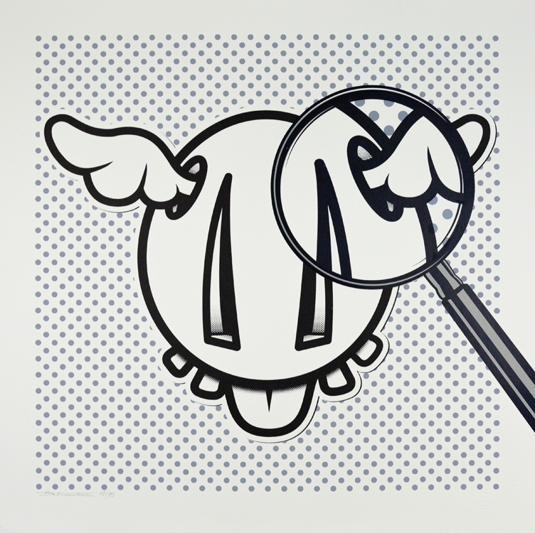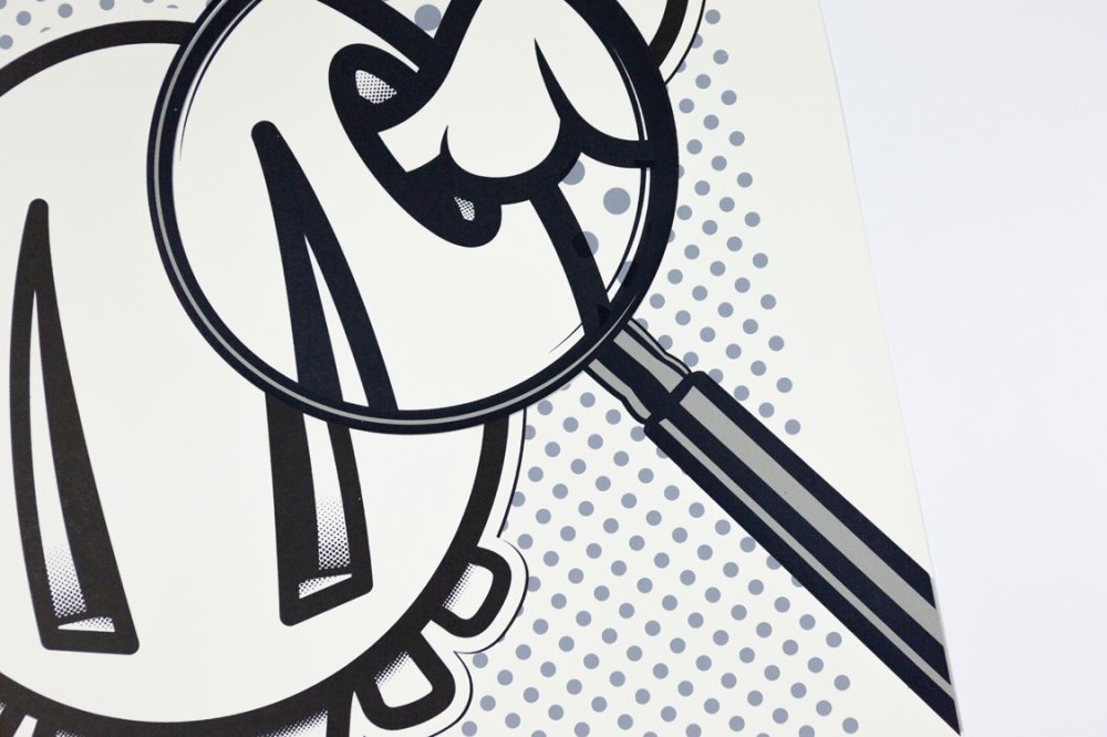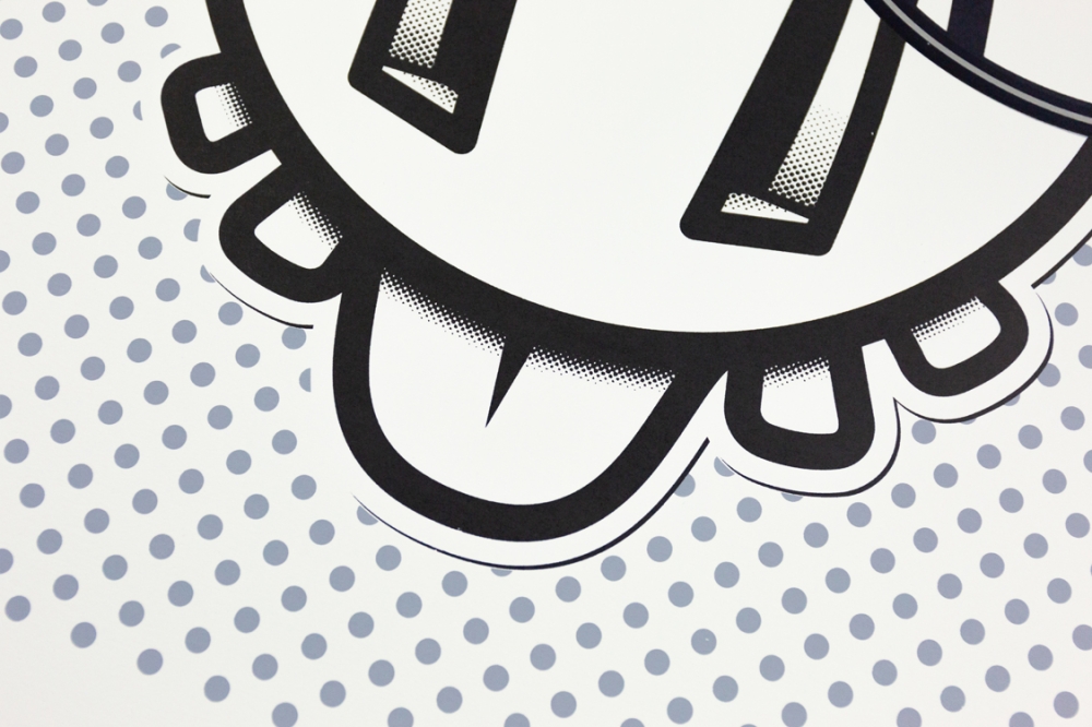 Zeefdruk van de Engelse multimedia street artist D*Face (Dean Stockton). D*Face groeide op in London en had sinds kindsaf een bijzondere fascinatie met tekeningen in graffiti.