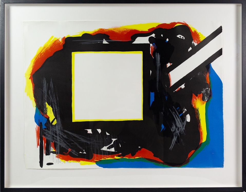 Bijzonder kleurrijke lithografie van Roger Raveel uit 1969, uit de Genesis reeks. Bij dit werk hoort een gedicht van Hugo Claus. Het werk is met de hand gesigneerd en genummerd als 31 van 80.