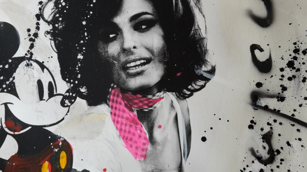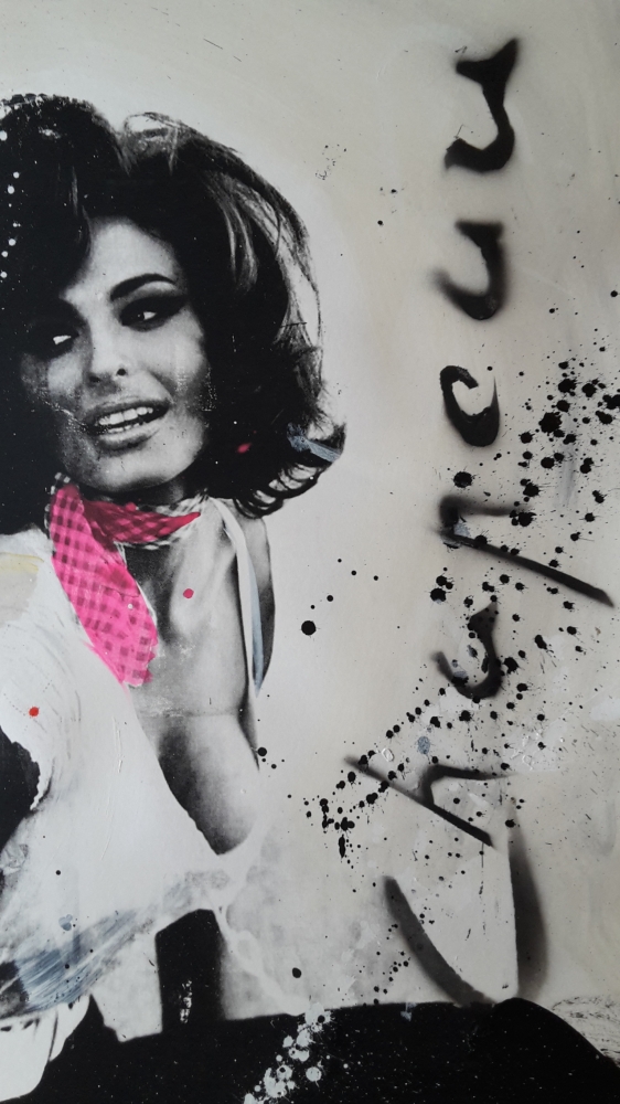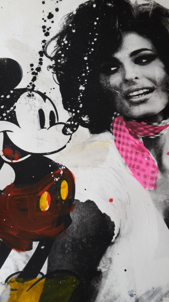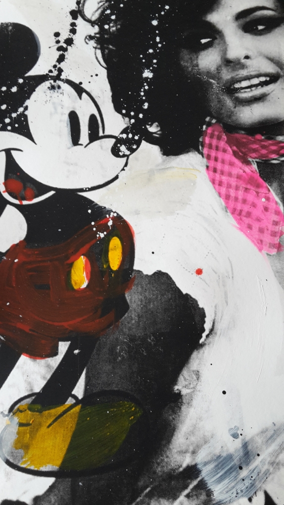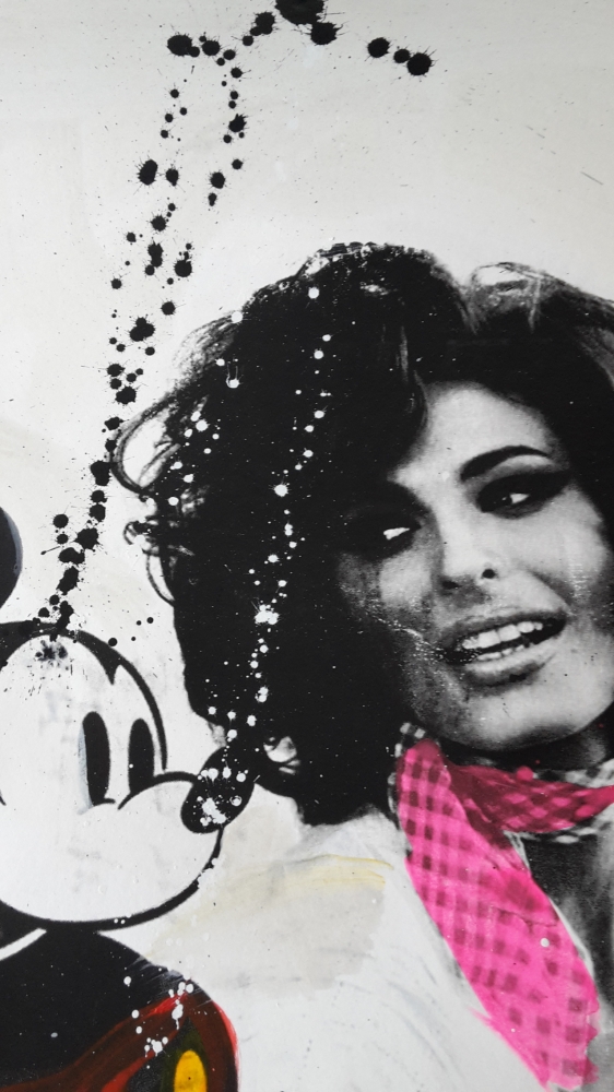 Mixed media van acryl over zeefdruk: acryl verf, graffiti en handgemaakt met zeefdruktechniek.