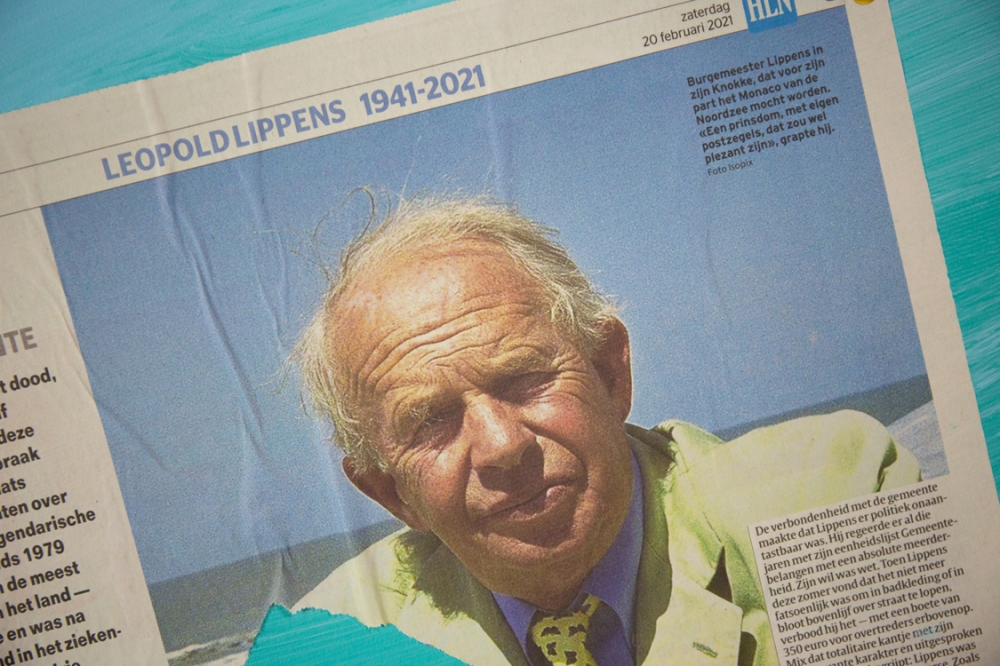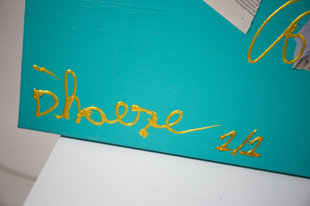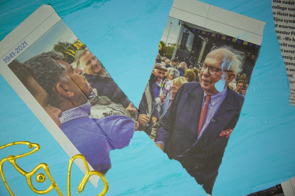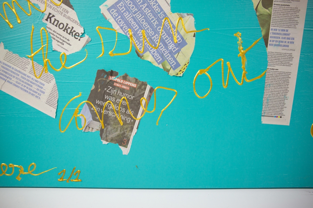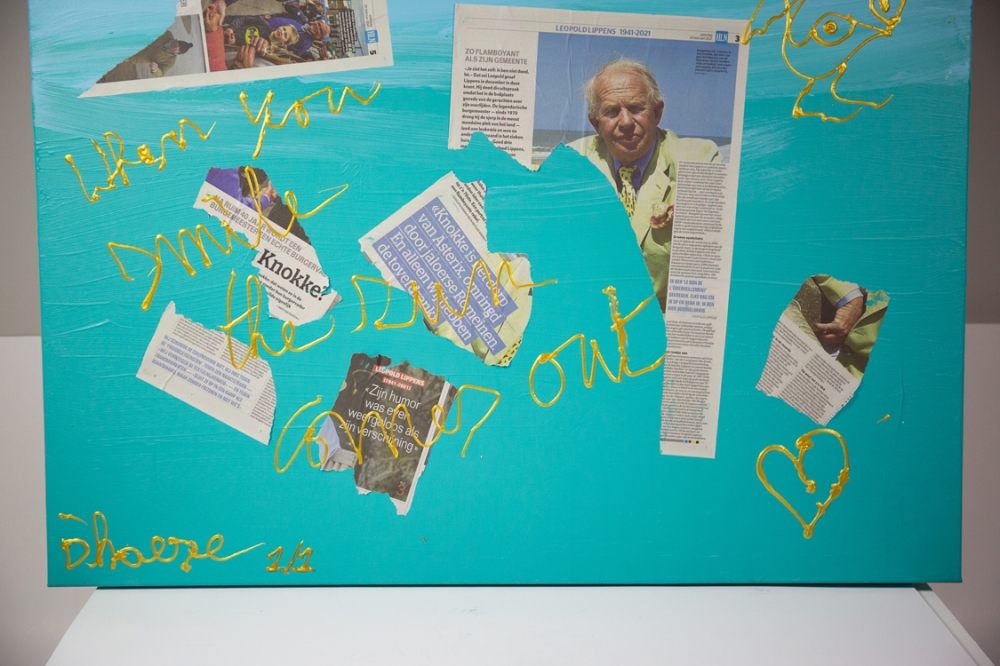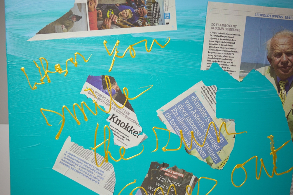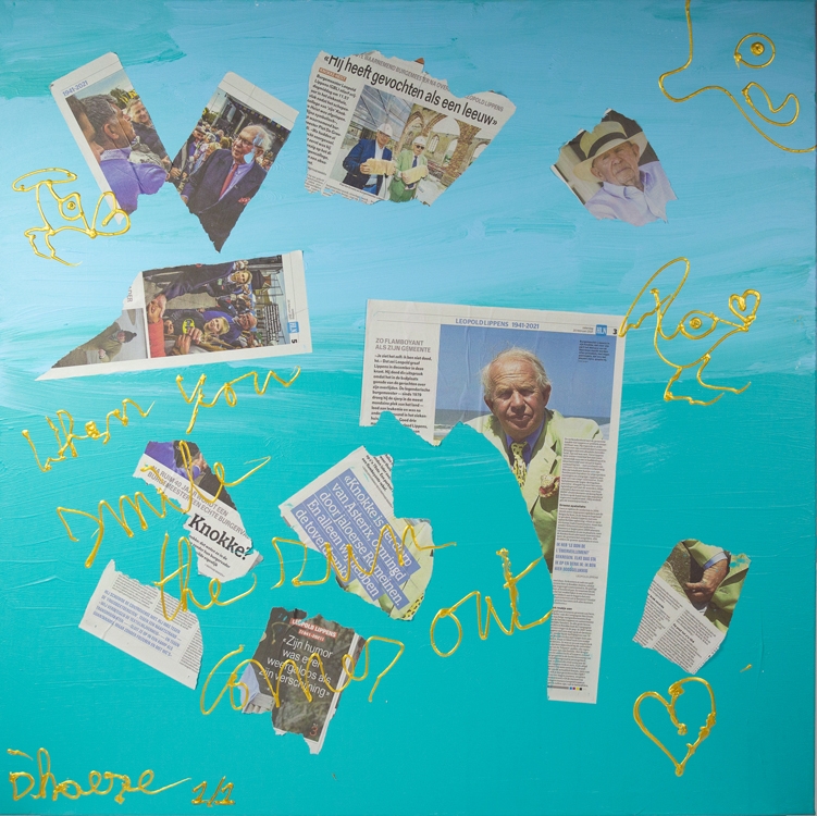 Acrylverfschilderij van Hannes D'haese, met als opschrift "When you smile the sun comes out". Krantenknipsels in combinatie met zijn unieke stijl vormen Hannes' eerbetoon aan Leopold Lippens.