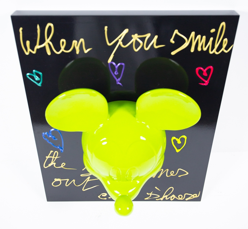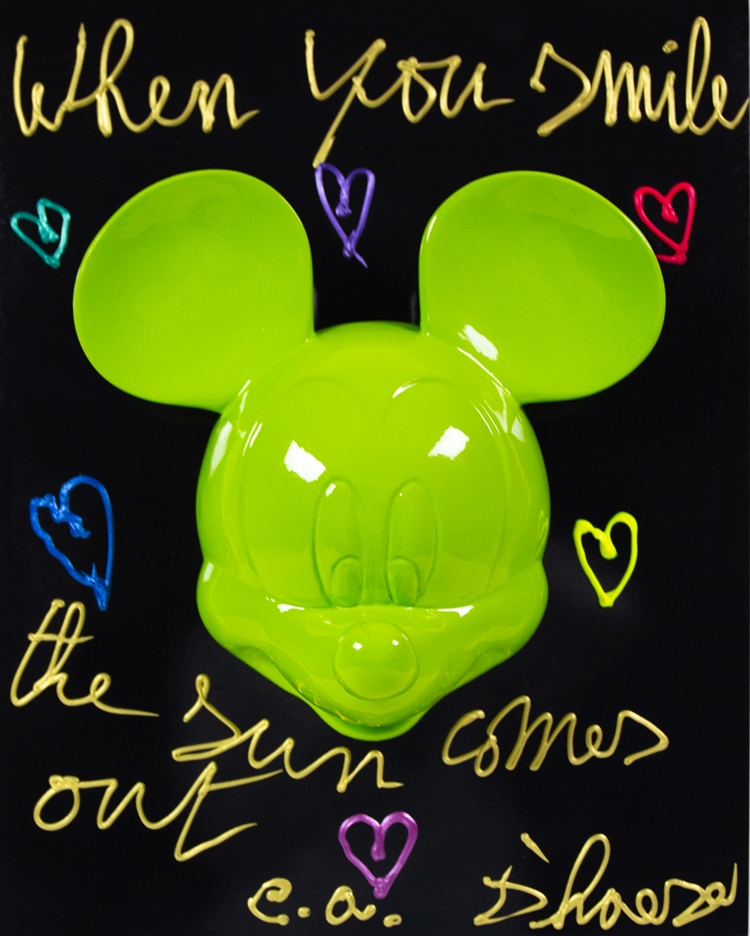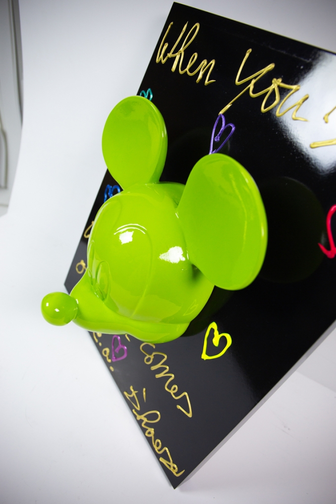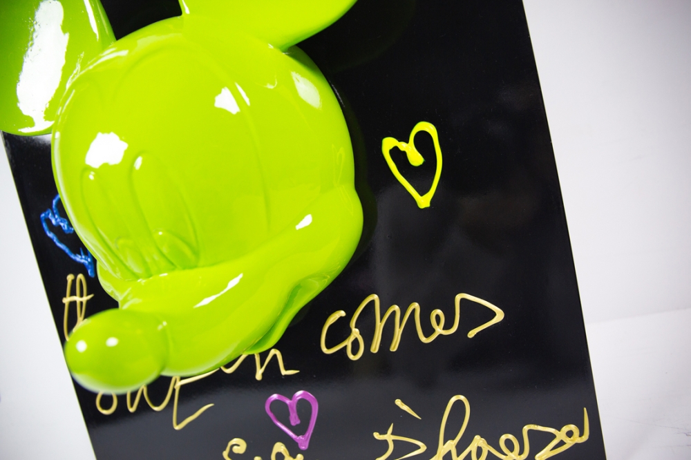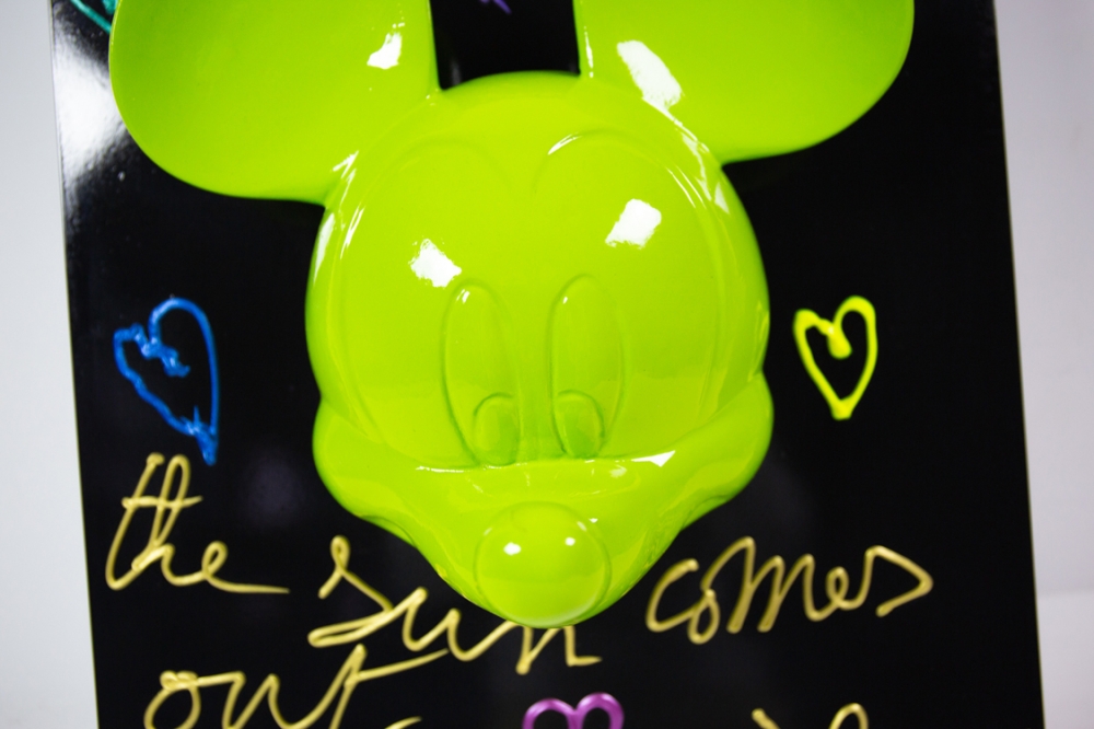 Het opschrift is aangebracht met acrylverf op een gelakeerde plaat, waar ook een scluptuur van Mickey Mouse is op gemonteerd.