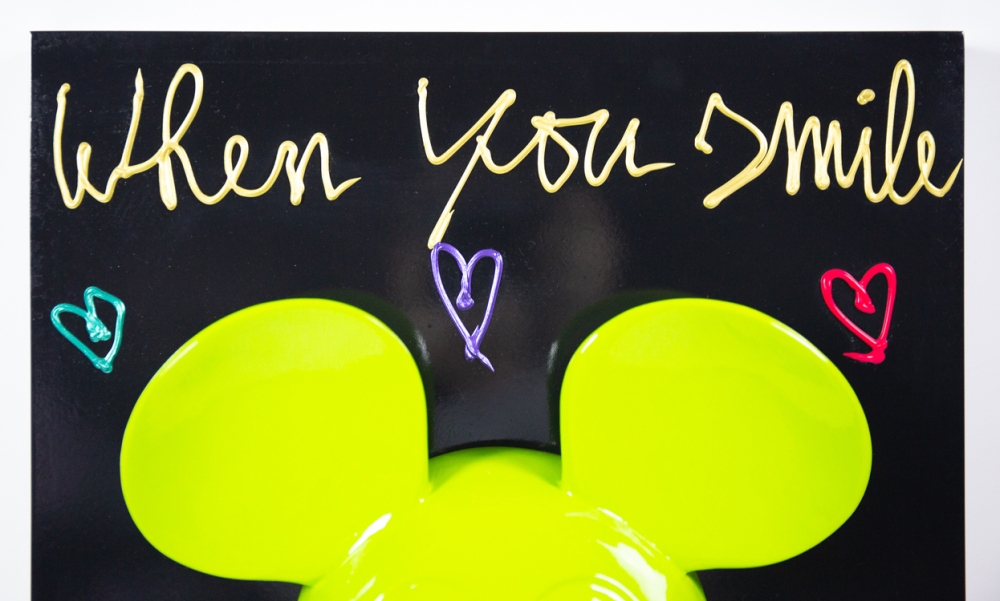 Mixed-media werk van Hannes D'Haese, met als opschrift: "When you smile, the sun comes out".