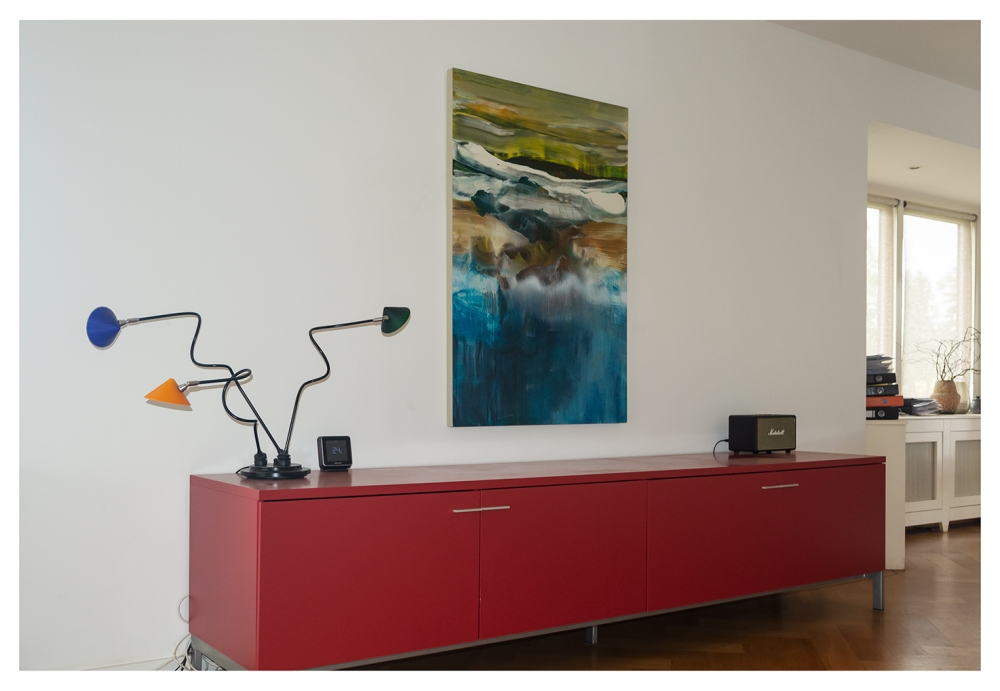 Dit schilderij is nummer één uit een reeks van drie werken. Het werk is geschilderd op MDF en is daardoor 13 kg zwaar. De reden van het MDF is een experiment en heeft onder andere te maken met het dat ik de verf ook wilde laten vloeien zonder dat de verf naar het midden loopt. De achterzijde is verdiept om kromtrekken te voorkomen. Het geheel is voorzien van een stevig ophangsysteem. Er is in mijn ogen een bijzonder mooie serie ontstaan van drie abstracte landschappen. Dit werk heeft als hoofdthema een zeezicht. Meer werk van Lambert is te vinden op zijn website: https://www.lambertoostrum.nl