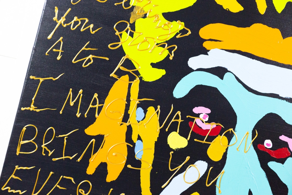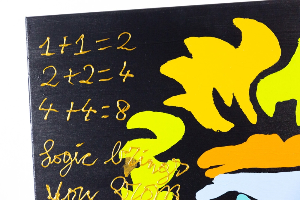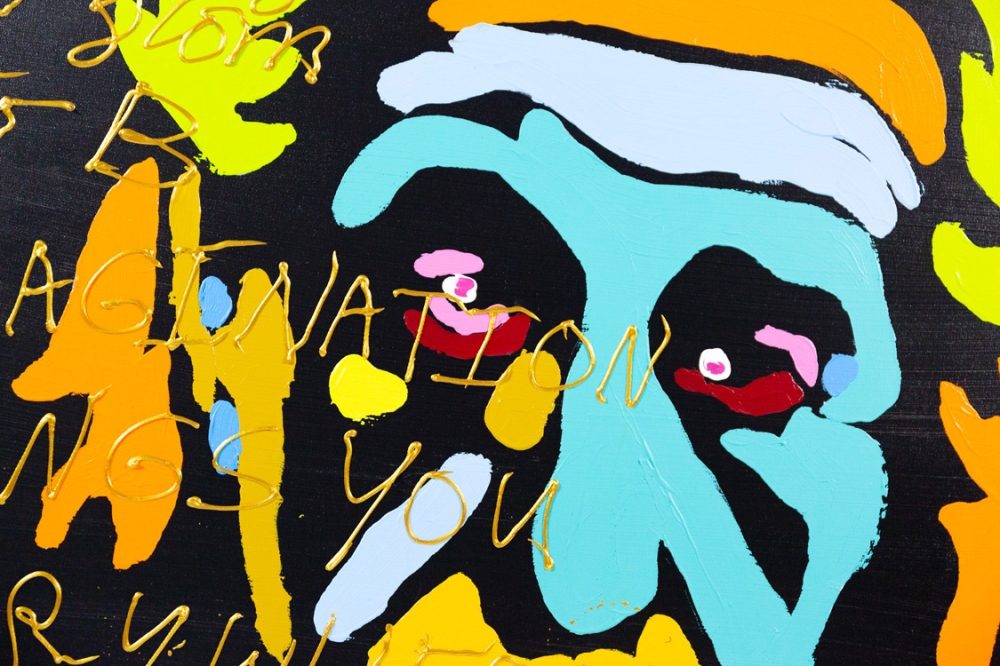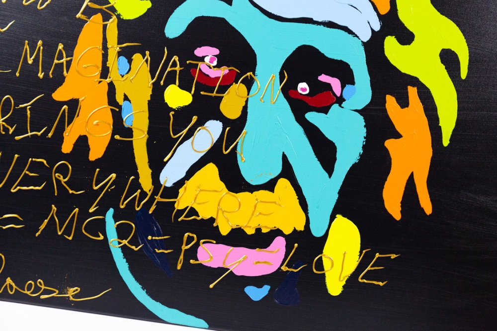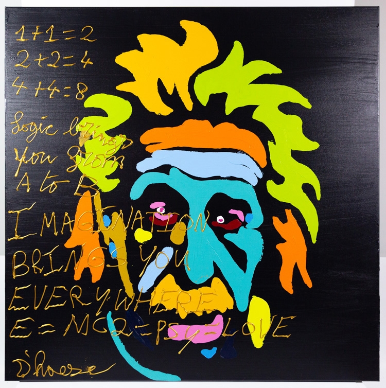 Schilderij met acrylverf van Hannes D'Haese op doek. Hierop wordt Einstein en de volgende spreuk afgebeeld: "1+1=2 2+2=4 4+4=8 Logic brings you from A to B, IMAGINATION BRINGS YOU EVERYWHERE, E=MC2 = PSY = LOVE"