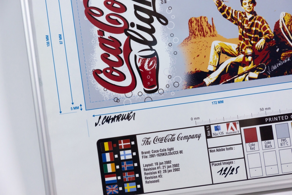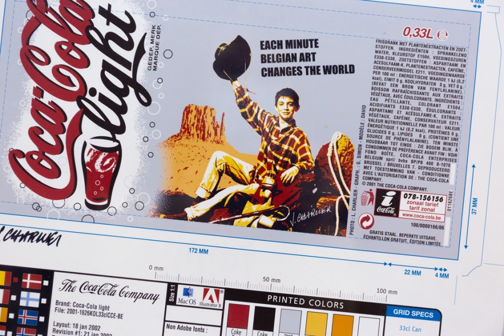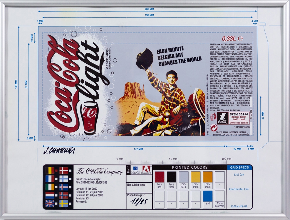 Collaboratie met Coca cola, dat beperkt blikjes met dit ontwerp van Jacques Charlier uitbracht in 2002. Genummerd als 12/25 en met de hand gesigneerd door de kunstenaar.