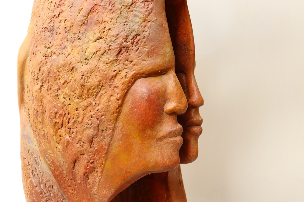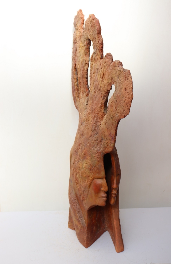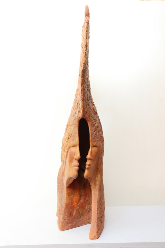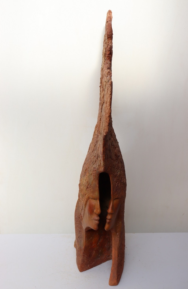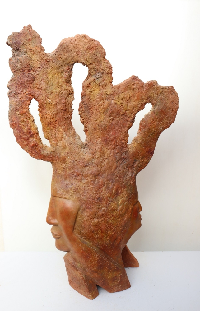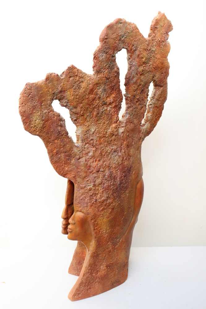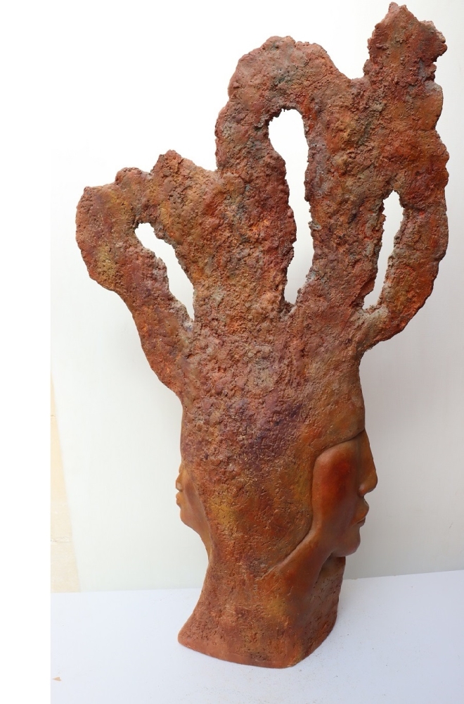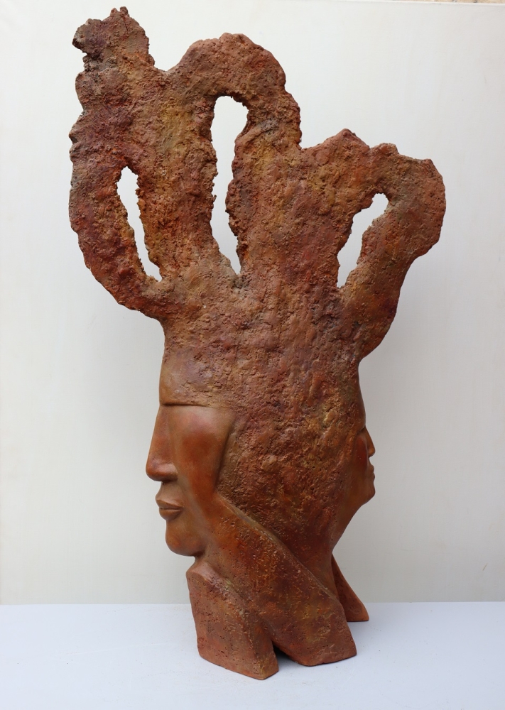 Grote Sculptuur rijzend in de ruimte met veel diepe warme kleuren patina met 3 gepolijste gezichten.