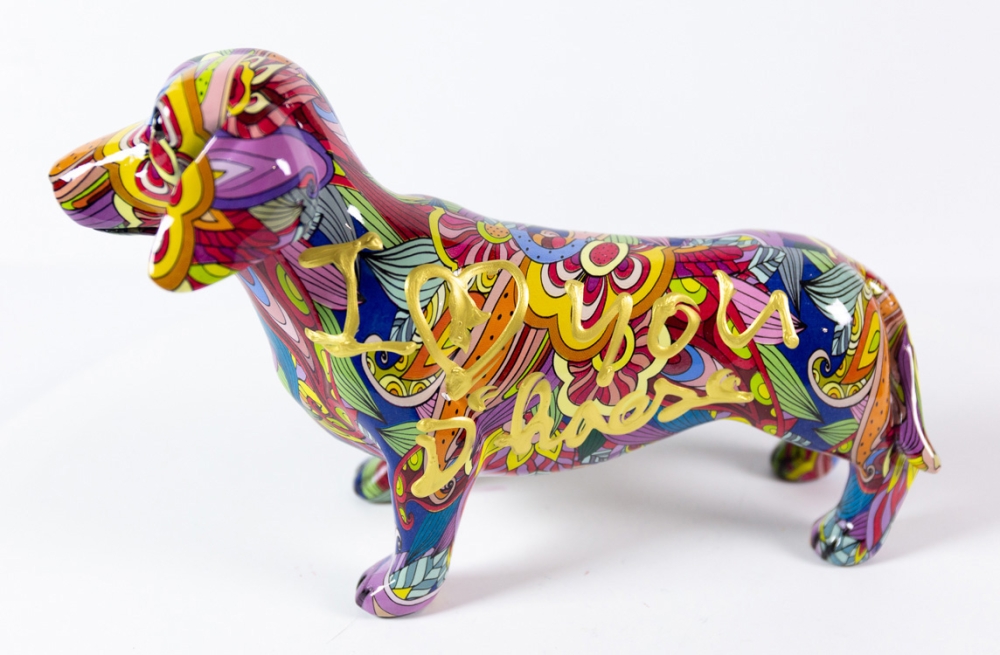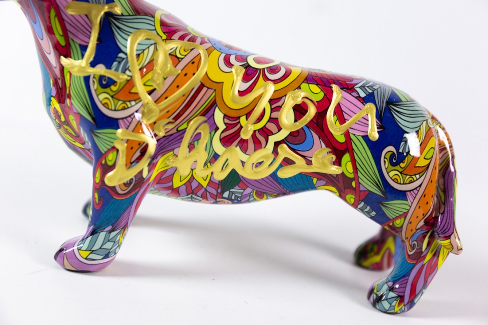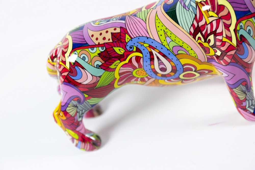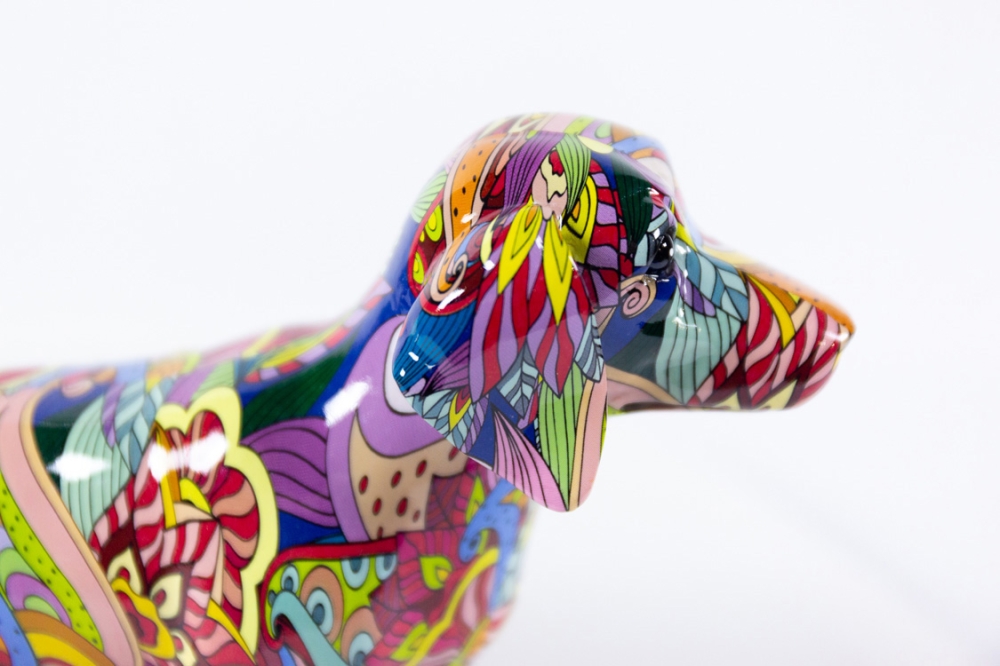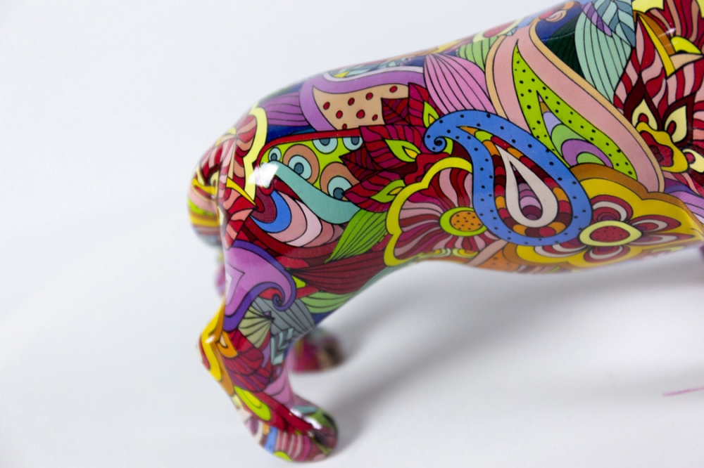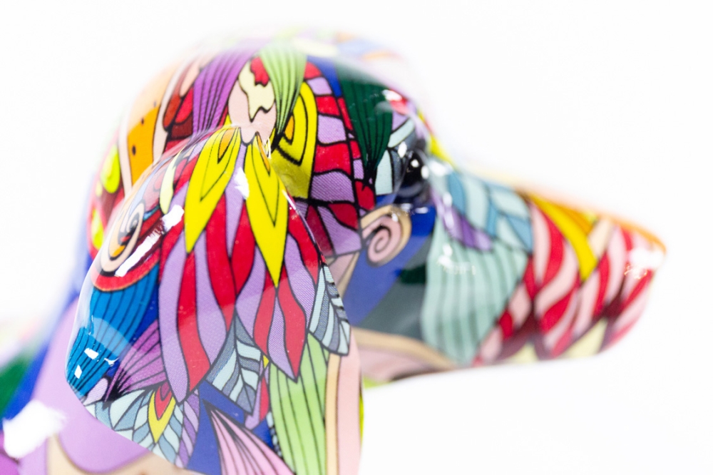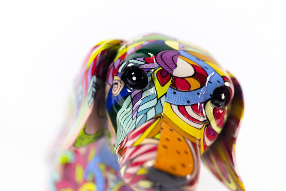 Sculptuur(tje) in kunsthars van Hannes D'Haese, het achtergrondbeeld is met hydrographics of water transfer printing aangebracht en daarna aangevuld met een beschildering met acrylverf.