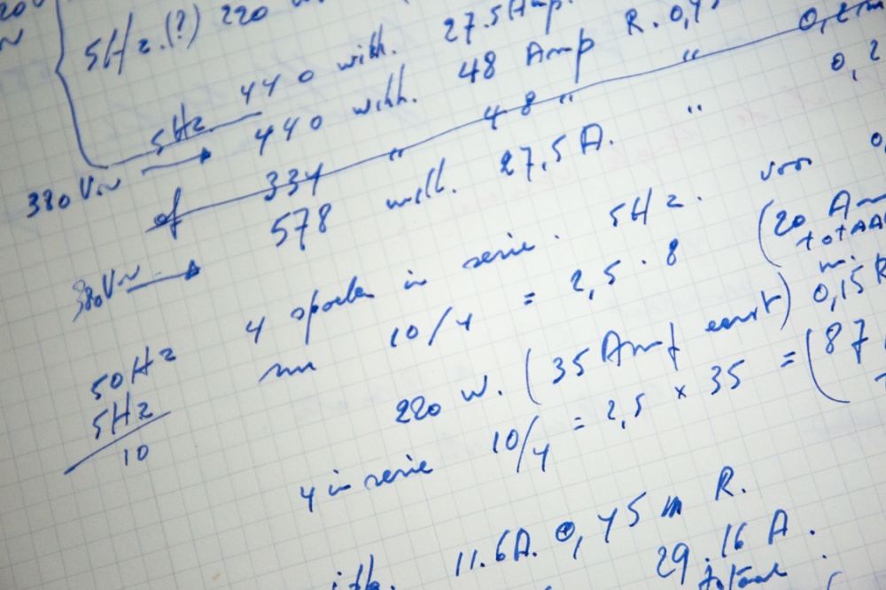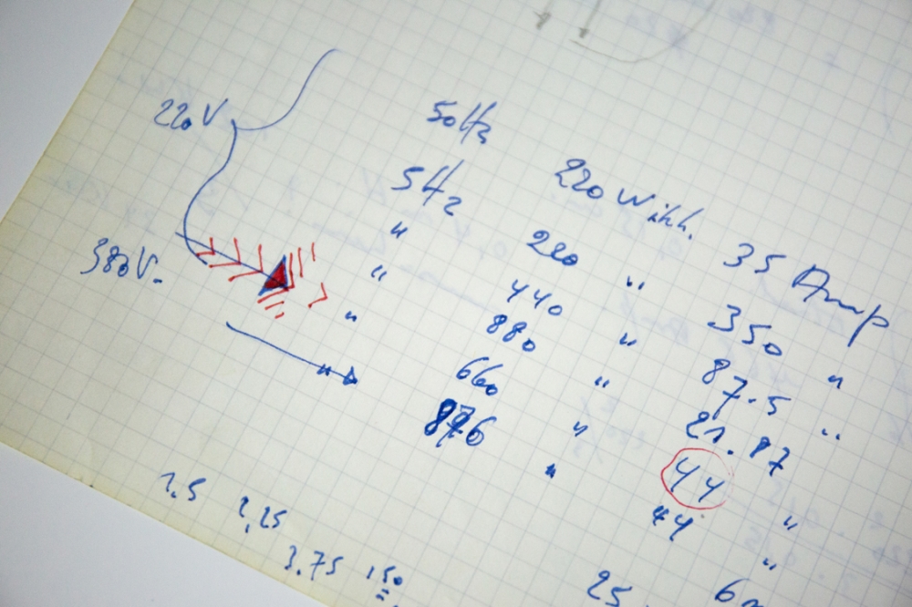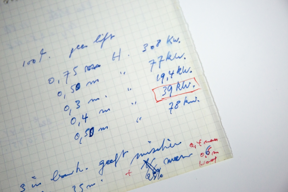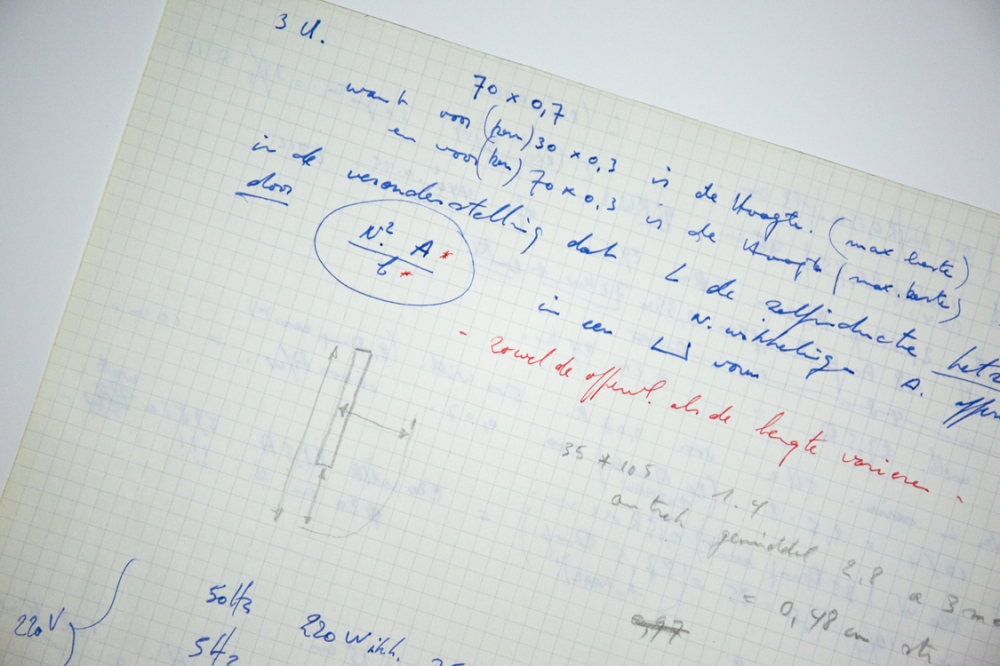 Originele, uniek beschreven pagina uit Panamarenko's persoonlijke schetsboek "Hou de tegengestelde polen in evenwicht en lift de machine" uit 1982. Op deze pagina, op beide bladzijden (zie foto 1 en 2), staan zijn berekeningen en bevindingen over de ontwikkeling van zijn magnetische of elektrische werken uit die periode. Deze paginas zijn het stille bewijs dat Panamarenko's werken meer dan alleen creatieve hersenspinsel waren en wel degelijk technisch en wetenschappelijk werden onderbouwd.