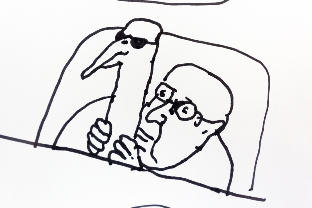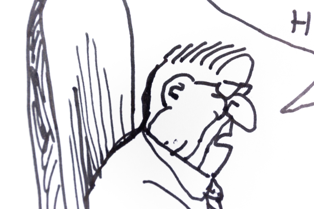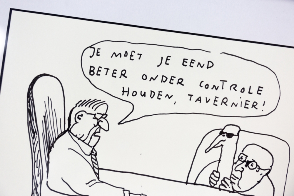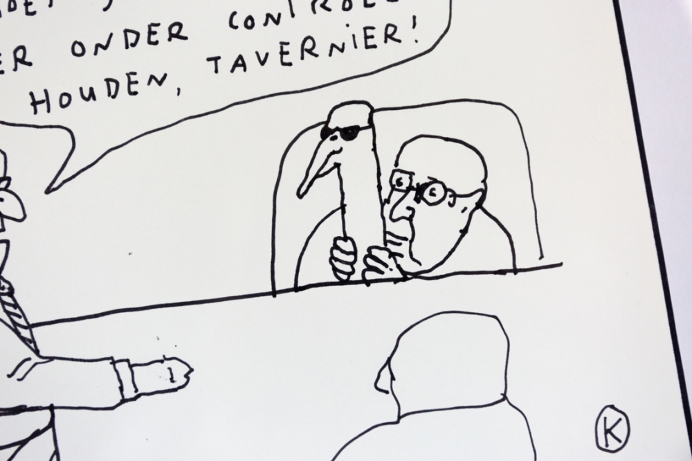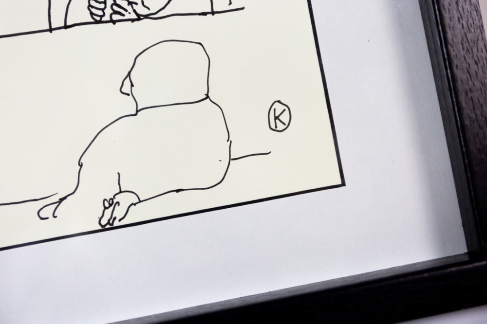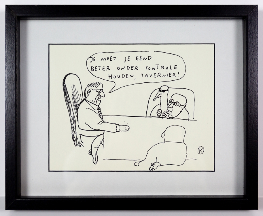 Originele tekening op papier van Kamagurka. Ingelijst in een sober zwarte kader met witte passe-partout en een zwart randje.
