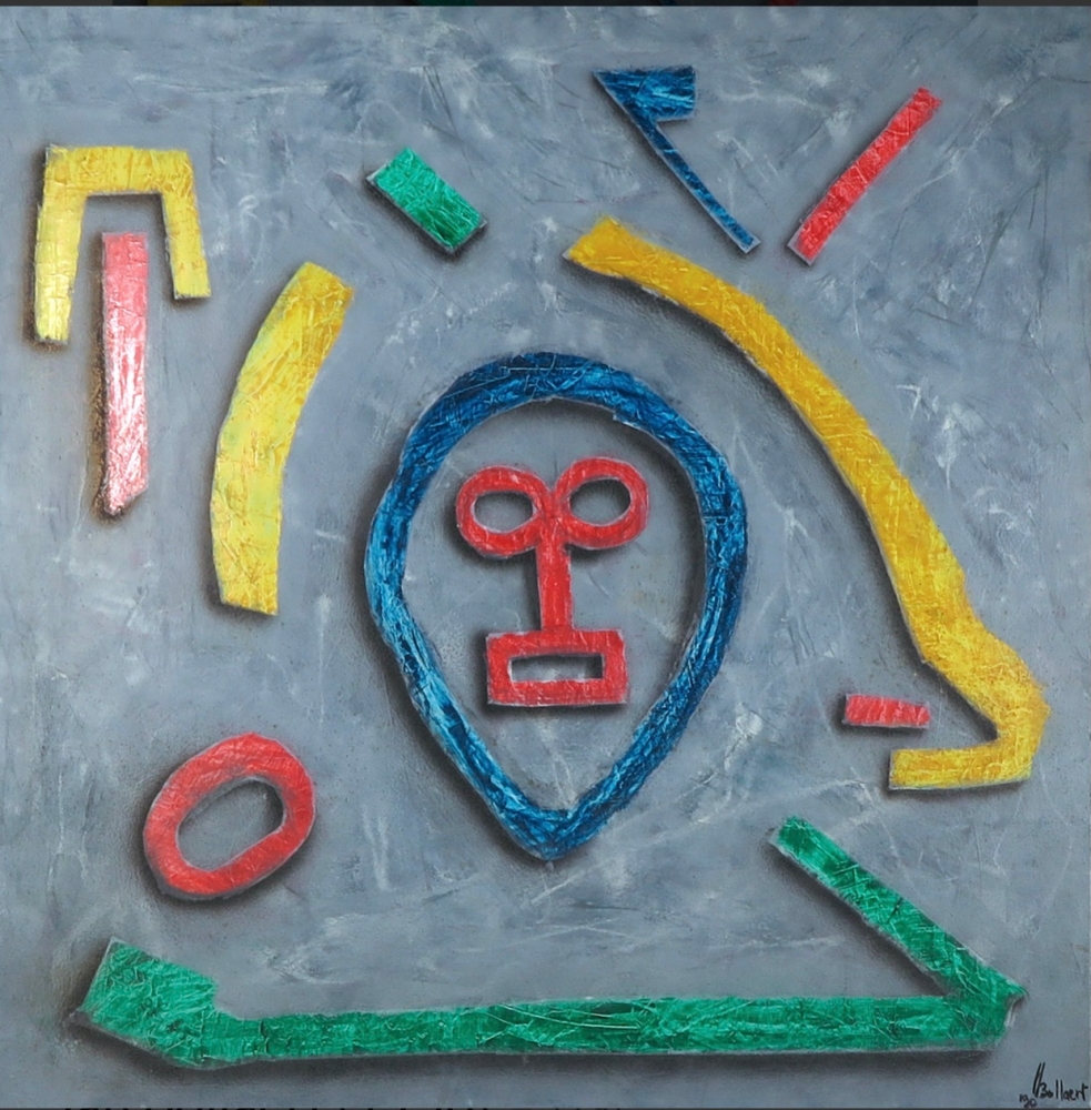 Zeer fraai werk van de kunstenaar Jan Bollaert. Acryl op papier, verlijmd op marouflé. De achtergrond is vervaardigd uit uitvergrote historische boeken of documenten. Het werk is op de keerzijde gesigneerd.