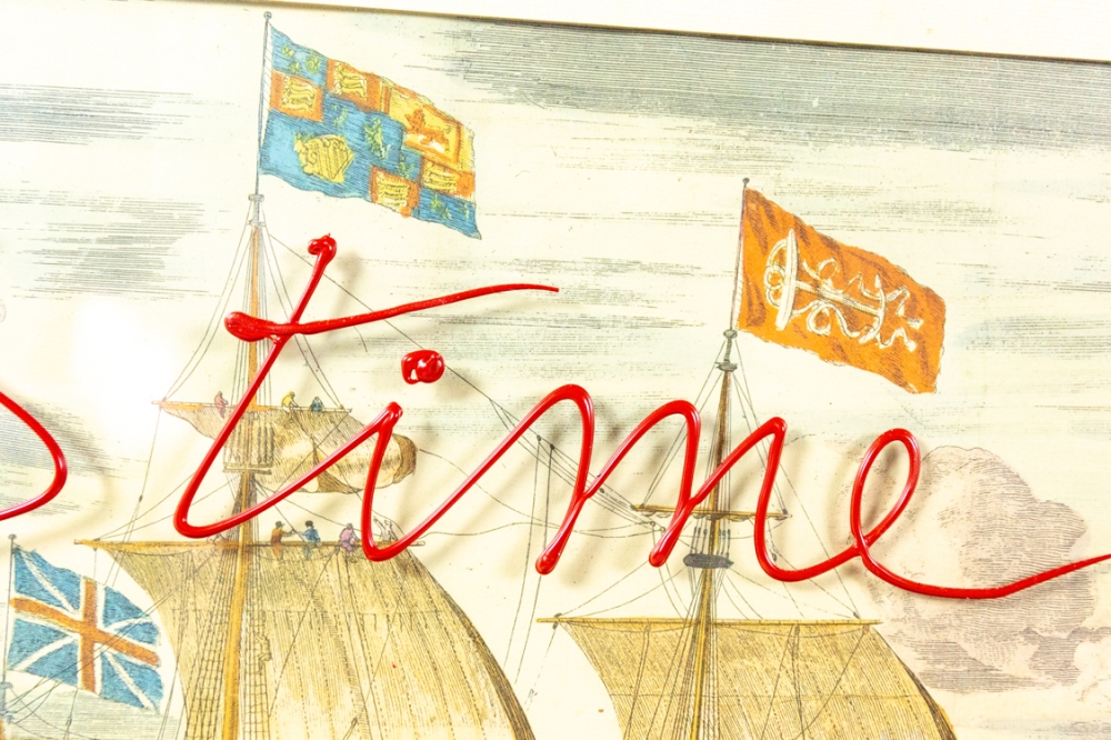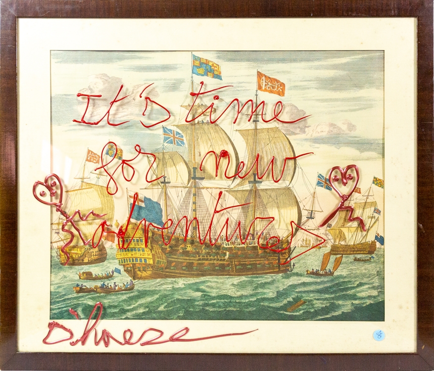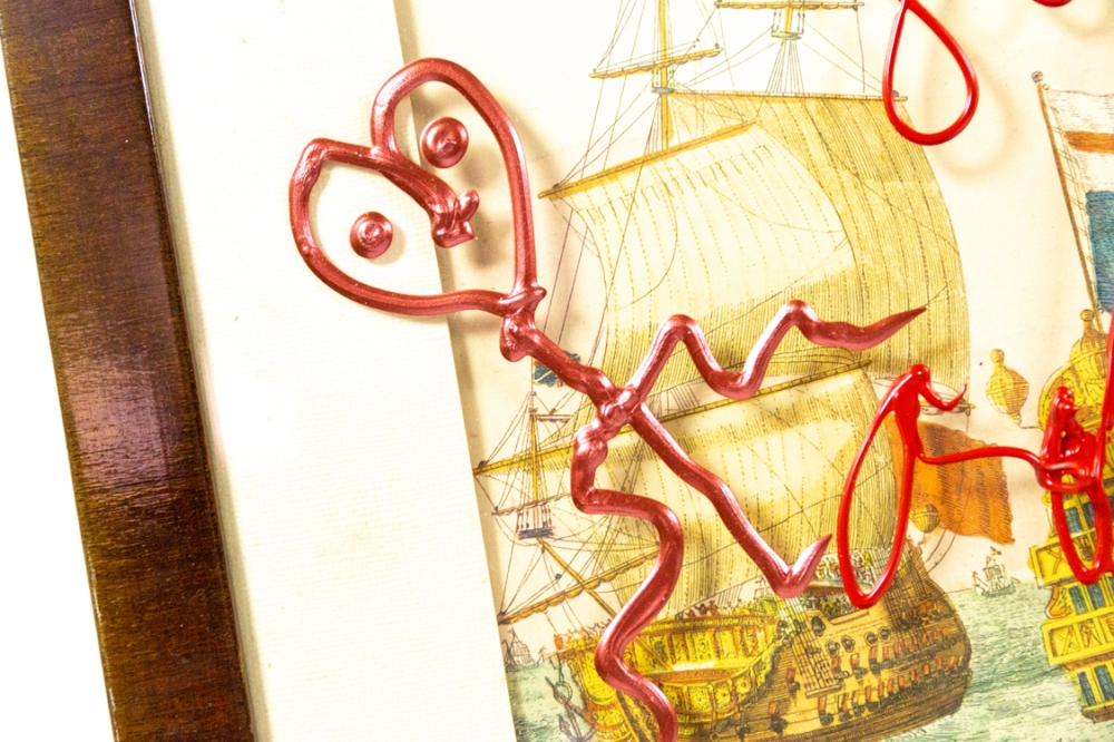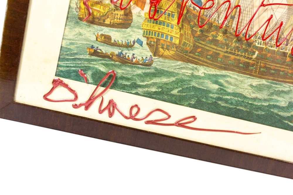 Mixed Media kunstwerk van Hannes D'Haese, over een oude print van een zeeslag (onbekend). De acrylverf werd op het glas aangebracht. De totale afmetingen, inclusief kader zijn 64cm x 75cm. Zowel de kader als het oudere werk vertonen gebruikssporen en wat foxing.