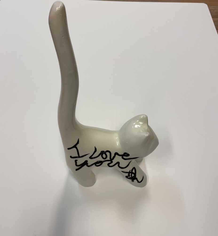 Sculptuurtje uit kunsthars van Hannes D'haese. Aangevuld met een opschrift en handtekening in acrylverf. Het opschrift luidt: "I love you".