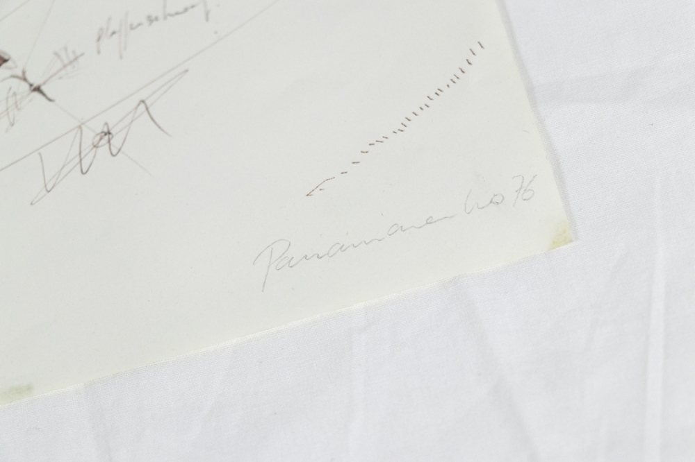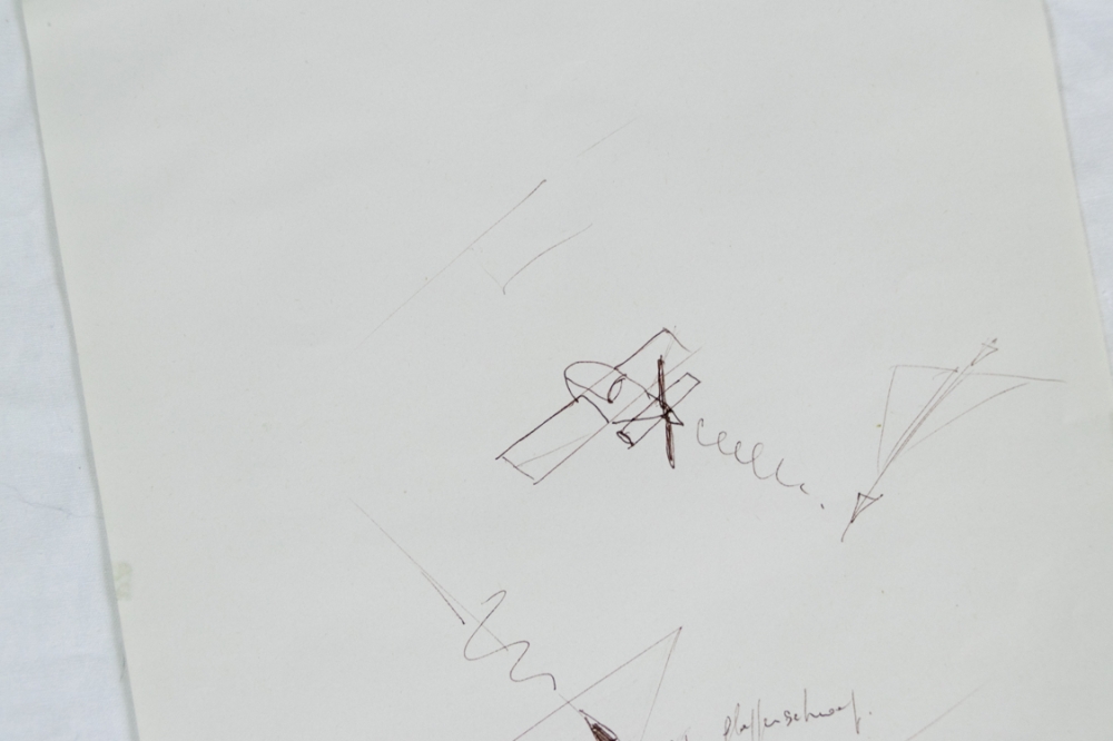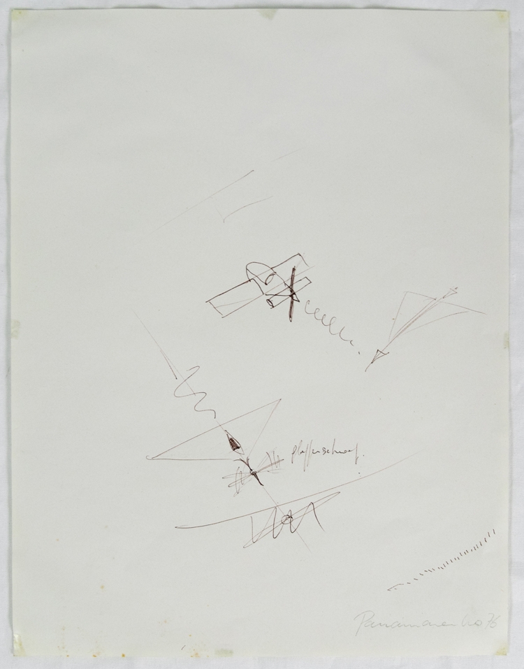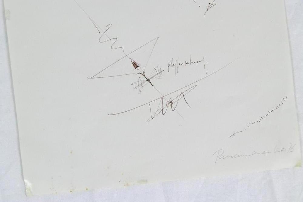 Originele, unieke tekening van Panamarenko uit 1976. Hierop staat een U-Control III en een ontwerp dat lijkt op het elektrisch delta-vormig toestel "Piewan".