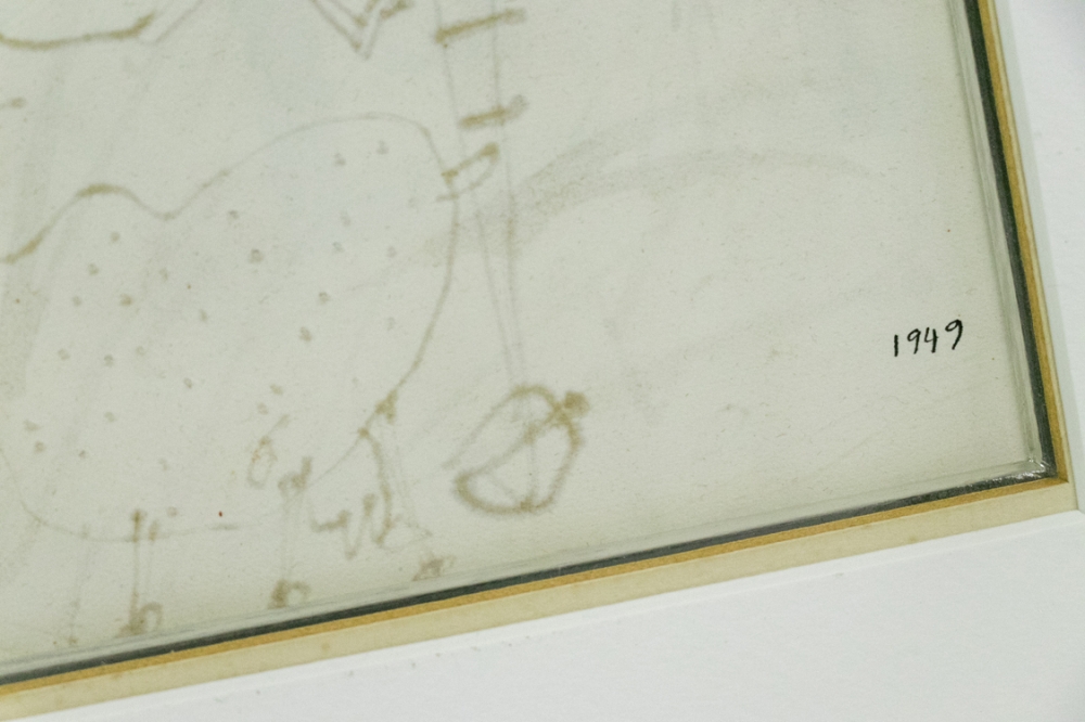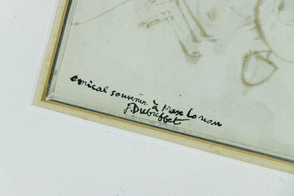 Met de hand gesigneerd en toegewijd aan Max Loreau, opschrift boven de handtekening "Comical souvenir a Max Loreau". Gedateerd rechts 1949.