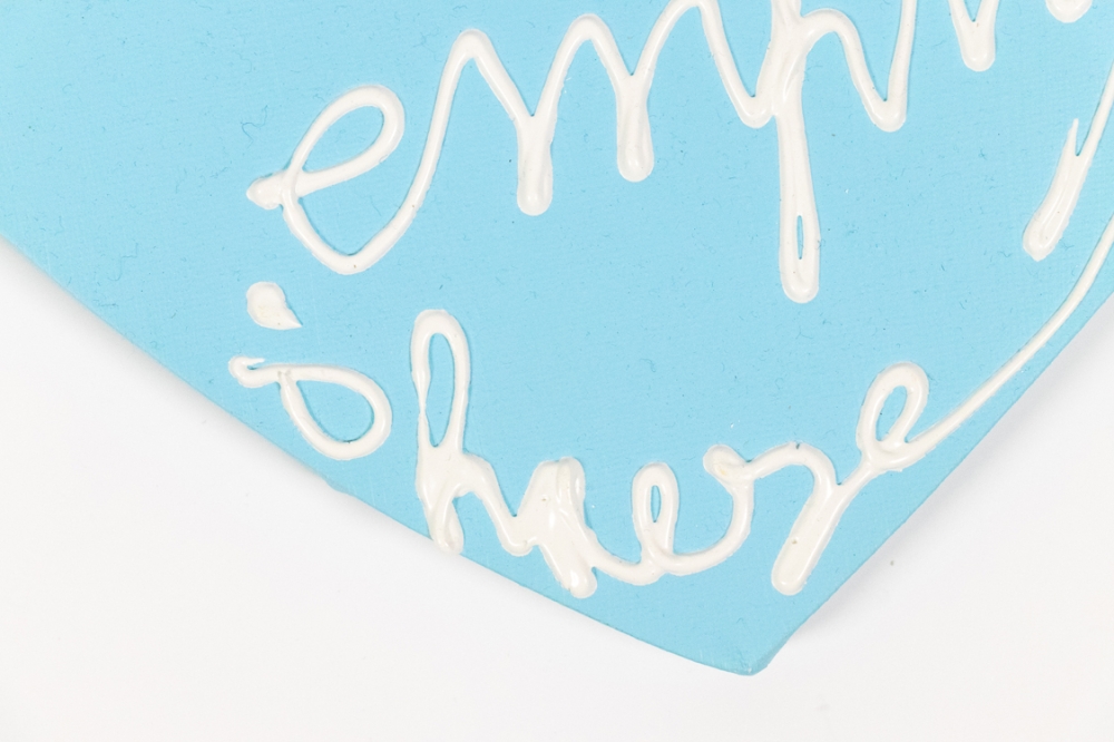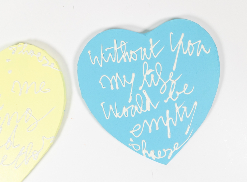 2 acrylverfschilderijtjes op canvas in de vorm van een hart. Elk is met de hand beschilderd en voorzien van een engelstalige spreuk. "Love is you & me growing old together", "Without you my life would be empty".