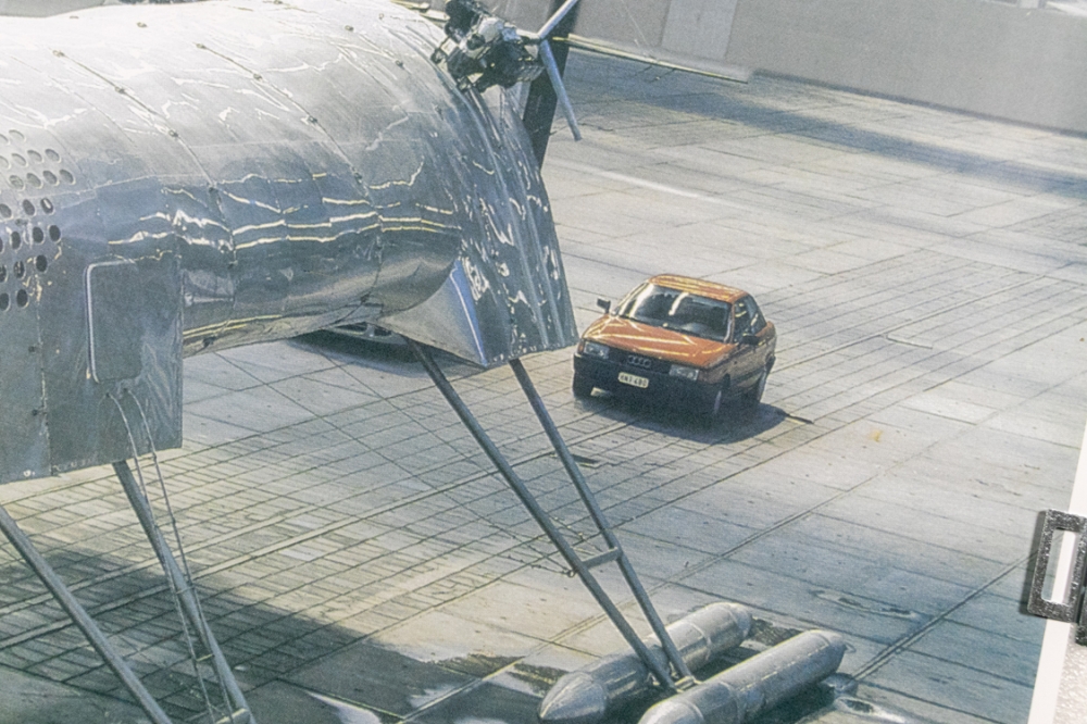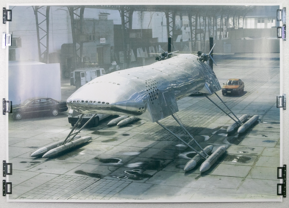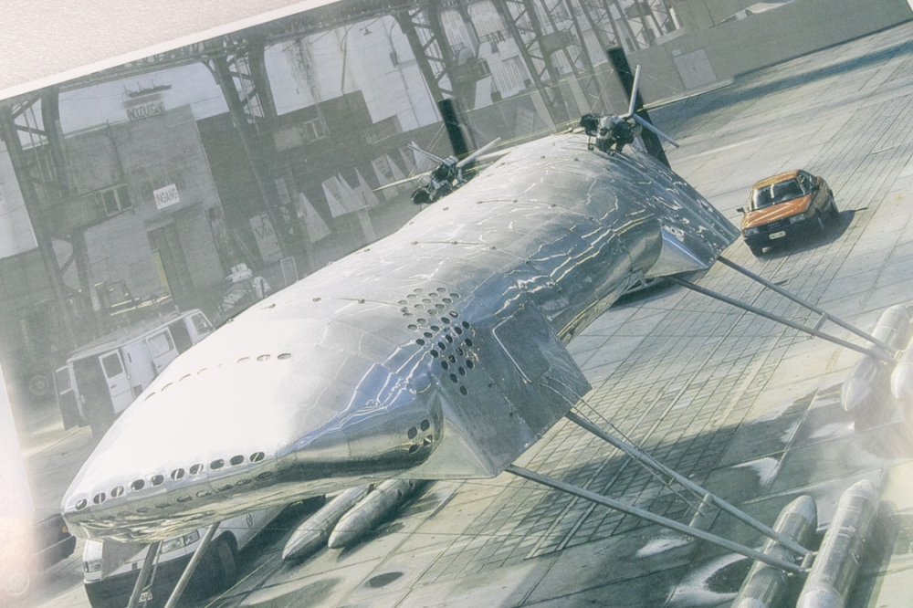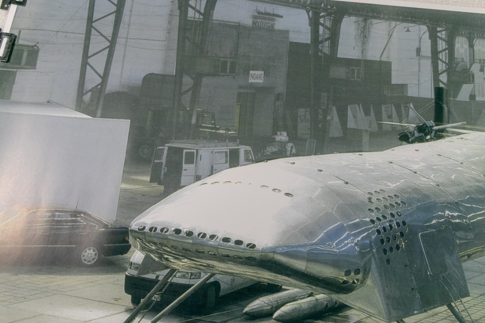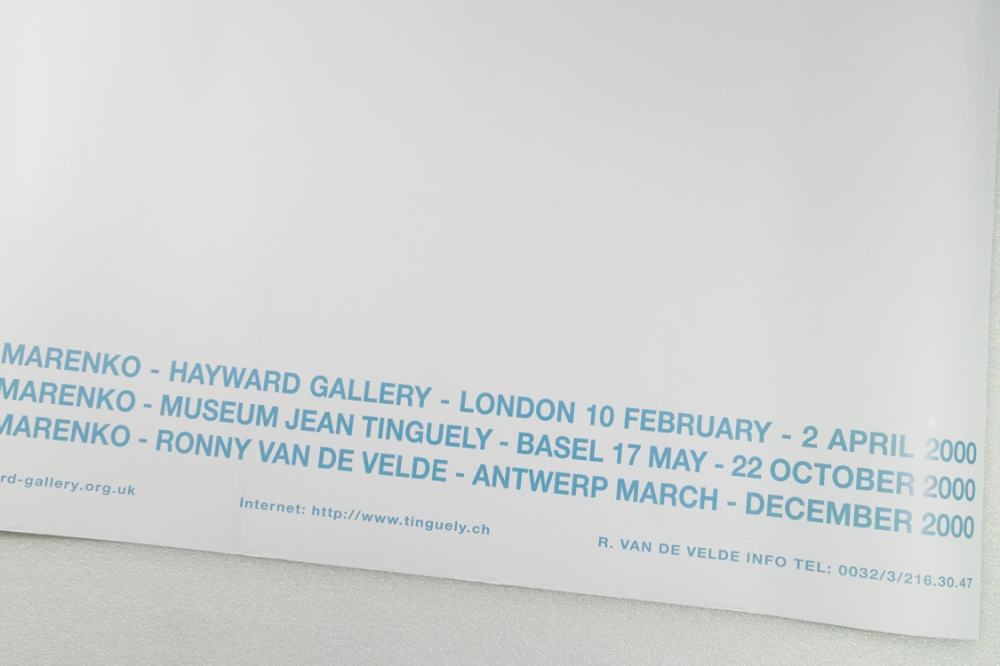 Grote offsetdruk, affiche gemaakt voor de tentoonstelling van Panamarenko in Hayward Gallery London en bij Ronny Van De Velde in Antwerpen in het jaar 2000. Op de affiche is de levensgrote opstelling van Scotch Gambit te zien.