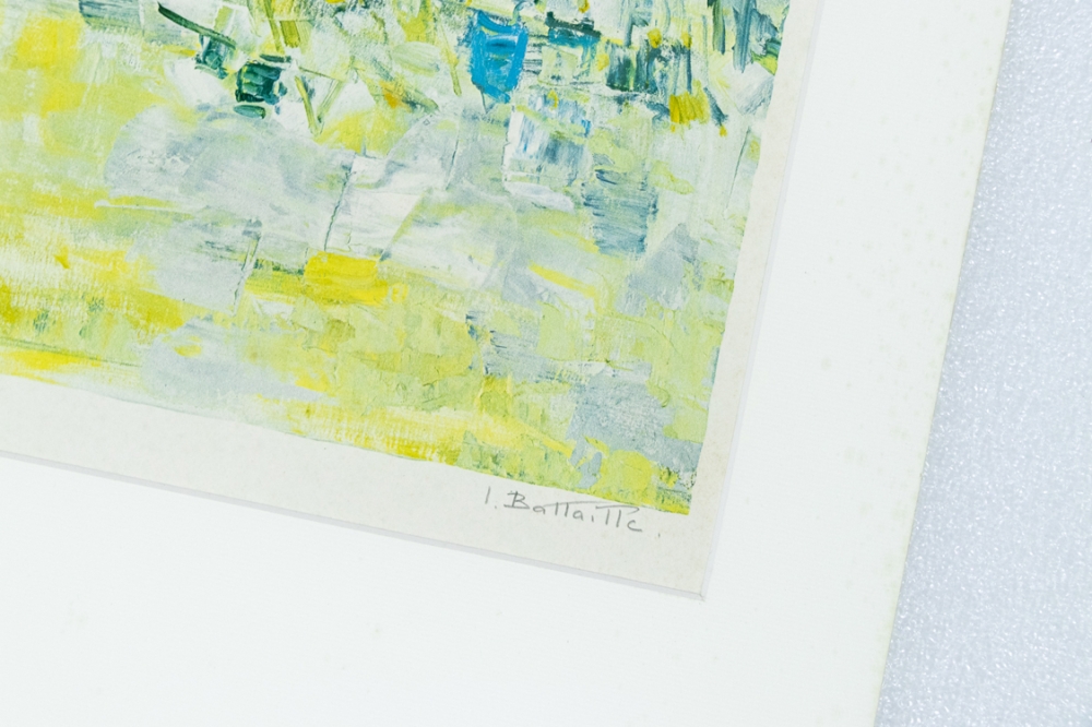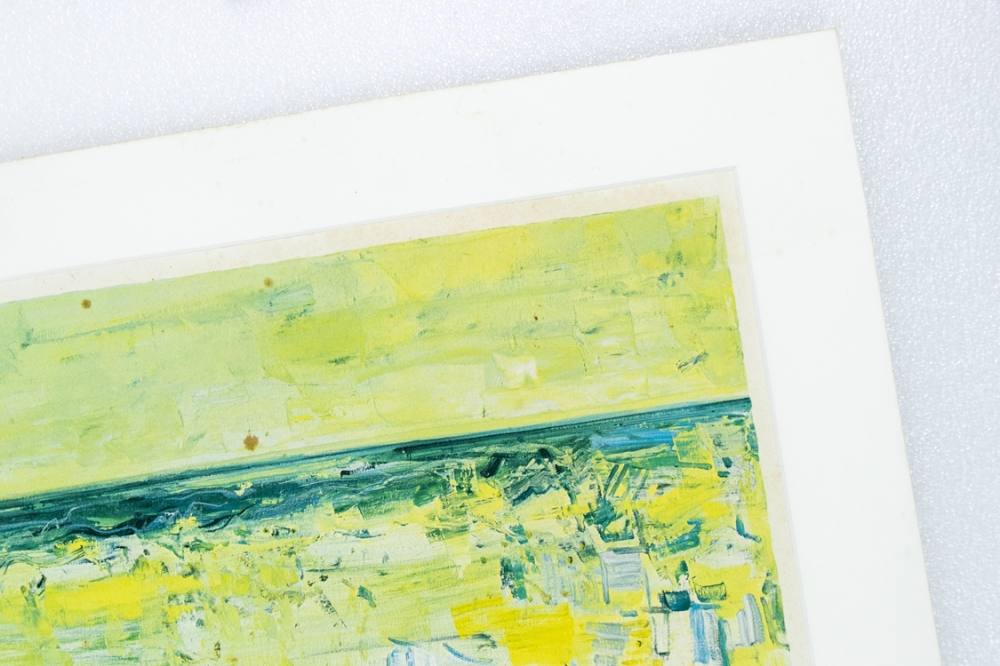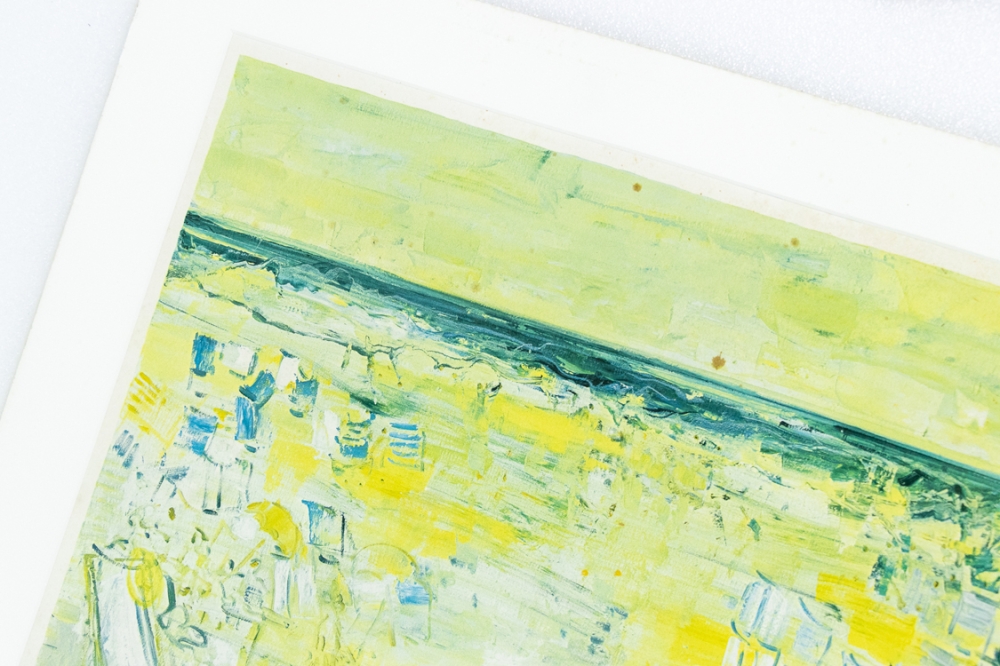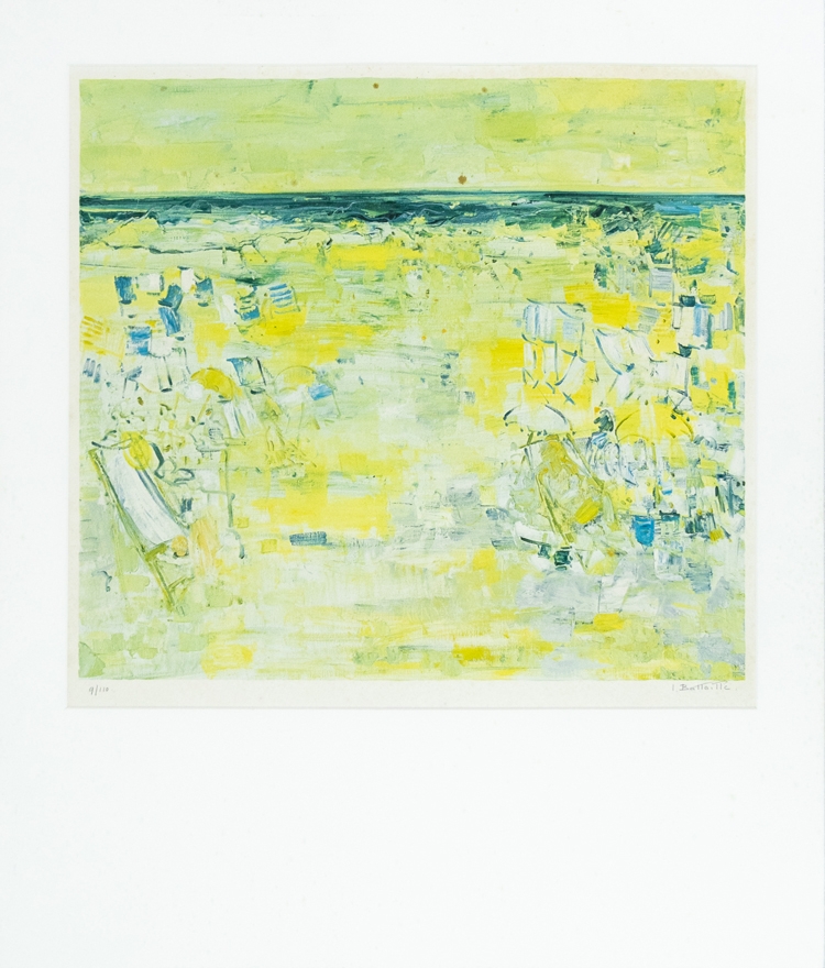 Zeefdruk van Irène Bataille op basis van één van haar Schilderijen. Op het beeld is een strandzicht te zien.