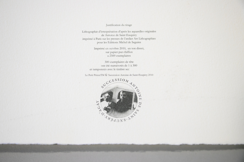 Print van Le Petit Prince uit 2010. Handtekening gedrukt en beperkt op een oplage van 2500, waarvan 300 genummerd. Dit exemplaar is ongenummerd.