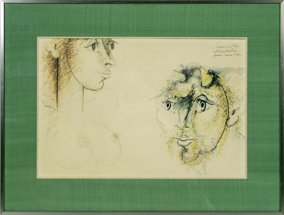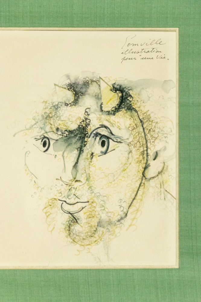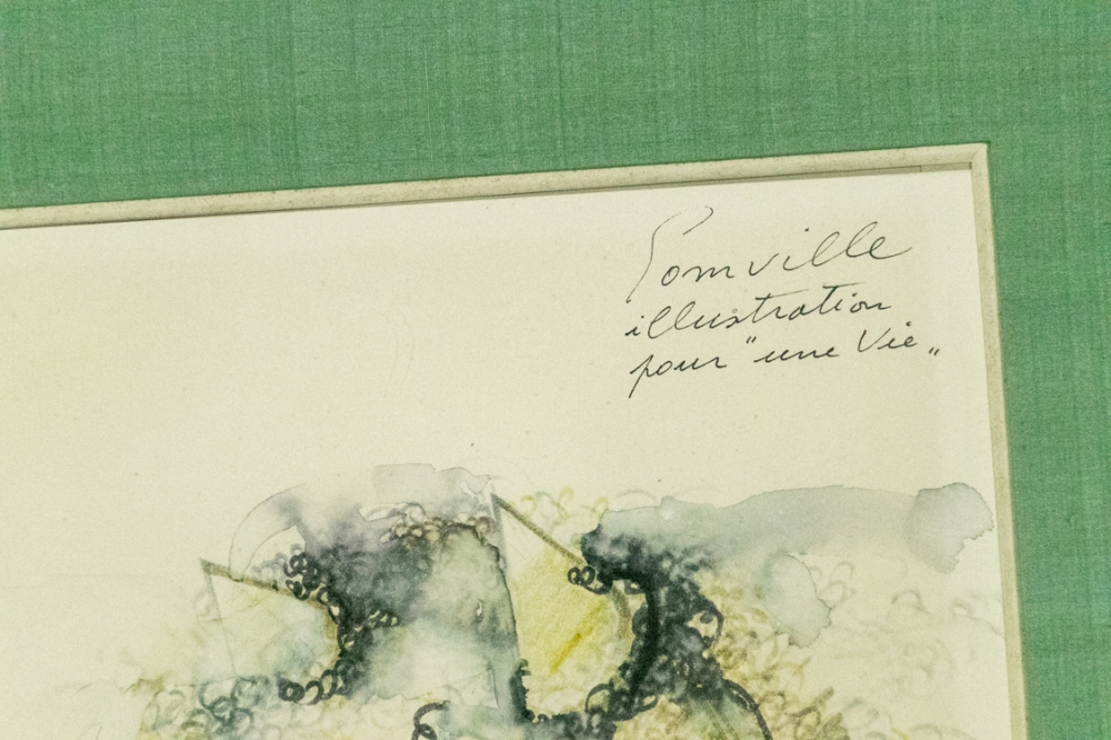 Tekening met stift en waterverf van Roger Somville, met als opschrift "Illustration pour 'une vie'".