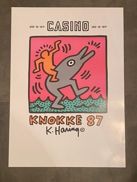 Casino Knokke België 1987 Zeer uniek zeldzaam item Originele litho van Keith Haring op de tentoonstelling in Knokke In tegenstelling tot andere affiches (in grote oplage) van deze tentoonstelling, vermeldt deze litho de data van de tentoonstelling. In zeer mooie staat. Ter promotie van de tentoonstelling is het werk 'Man rijdende dolfijn' gebruikt. Het thema van deze afbeelding werd later gebruikt voor een serie van 4 zeefdrukken genaamd Pop Shop V, die 2 jaar later werd uitgebracht. Het werk is in zeer goede staat. Totale afmetingen 70x50cm). Het geschatte aantal gedrukte exemplaren ligt rond de 150.
