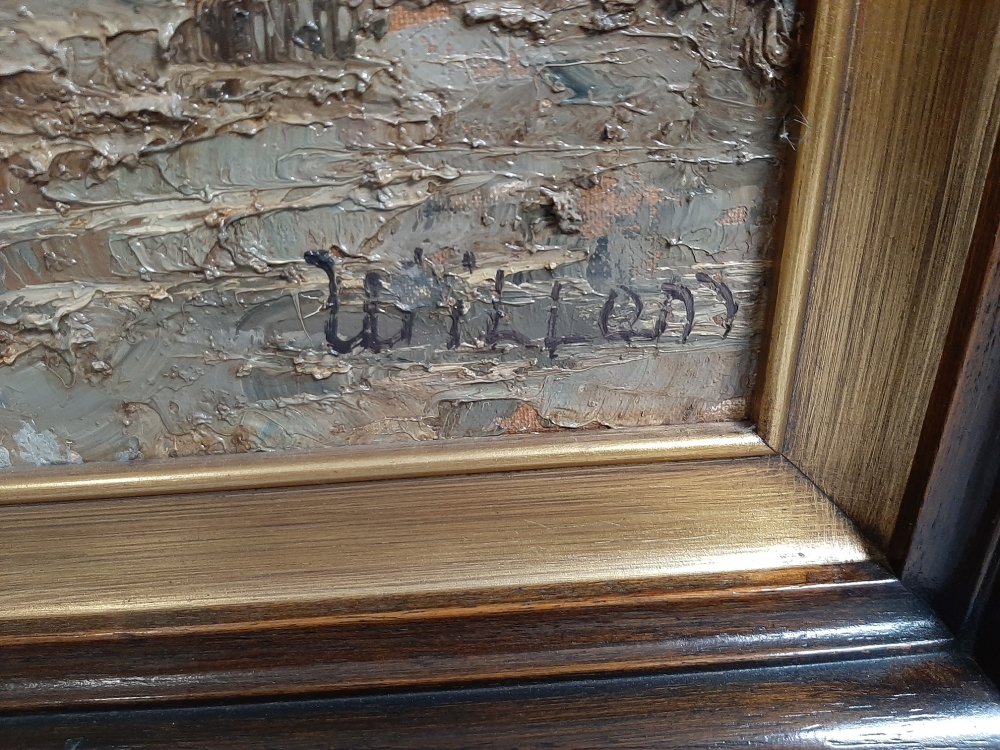 Marine met havenzicht. Gesigneerd Willem, waarschijnlijk een Nederlandse schilder Pie Willem. Prachtig werk met een typisch Hollands accent. Op art price staan slechts 2 werken van deze schilder vermeld.