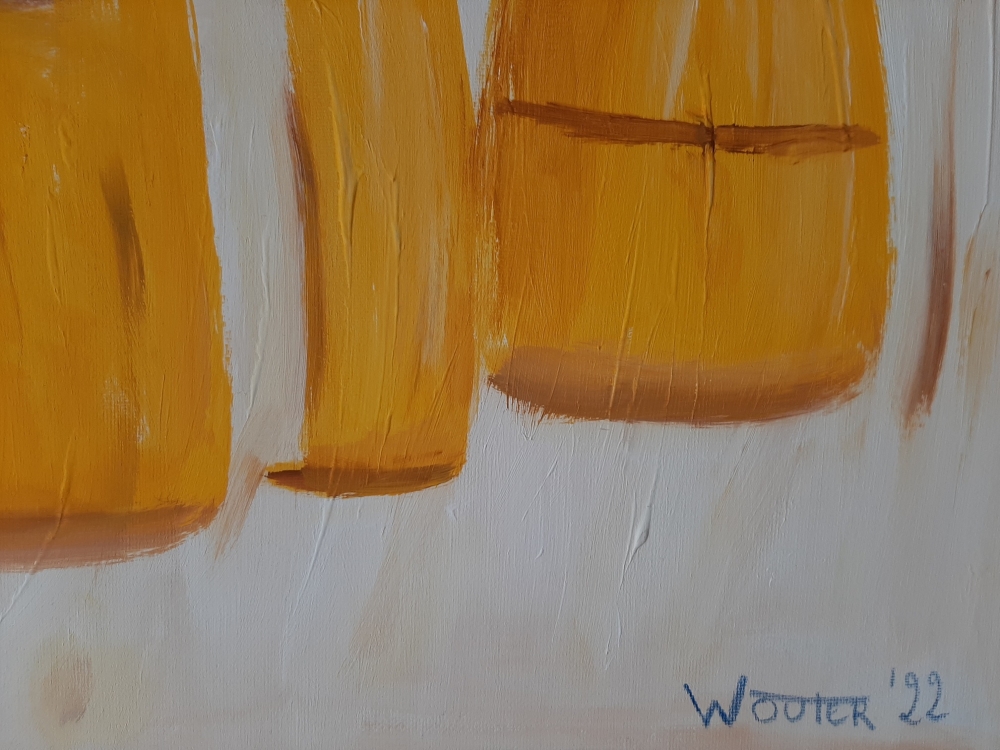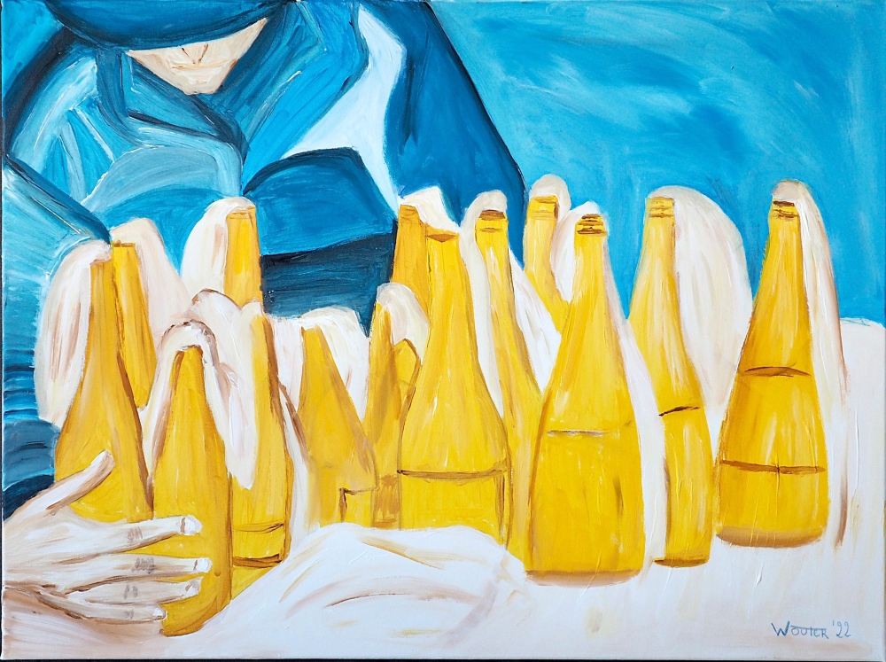 Het Verzet Schilderij 60x 80cm aangeboden door Wouter Beke. Wouter Beke is hobbyschilder, maakt portretten van regeringsleiders en bekende figuren in de actualiteit. De schilder stelt een Oekraiëner voor die na de oproep van pres. Zelenski molotovcocktails gereed maakt om weerstand te bieden tegen de Russische invasietroepen. Geschilderd in de Oekraiënse kleuren blauw geel.