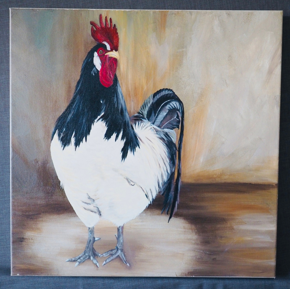 Mooi levensecht beeld van een haan, meester op het boerenerf welke zijn gezag laat zien. Conny Noblesse werd geboren in Diepenbeek volgde les in Kortessem bij "Atelier op Zolder" naast schilderen werkt zij ook met textiel.