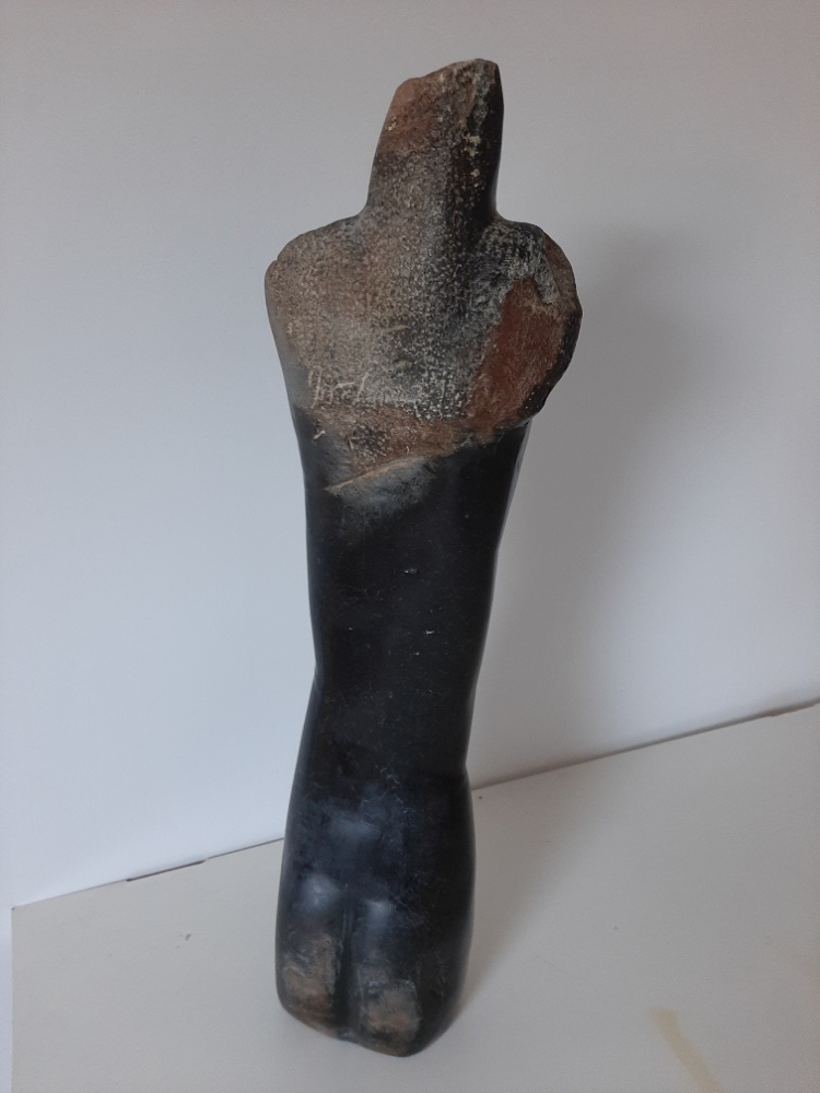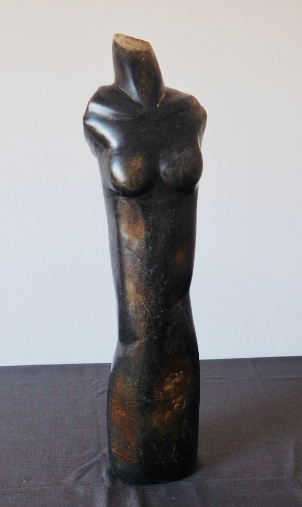 Vrouwentorso van Josy Baerten Bilzen. Slanke torso in zwartbruine natuursteen, hoogte 70 cm breedt 15 cm. Uit Braziliaanse speksteen zwart met bruin gele tinten, mat gepolijst met een ruwere afwerking achterzijde in de nek. Omwille van de smalle ranke vorm wordt dit beeld niet verzonden, en moet het worden afgehaald.