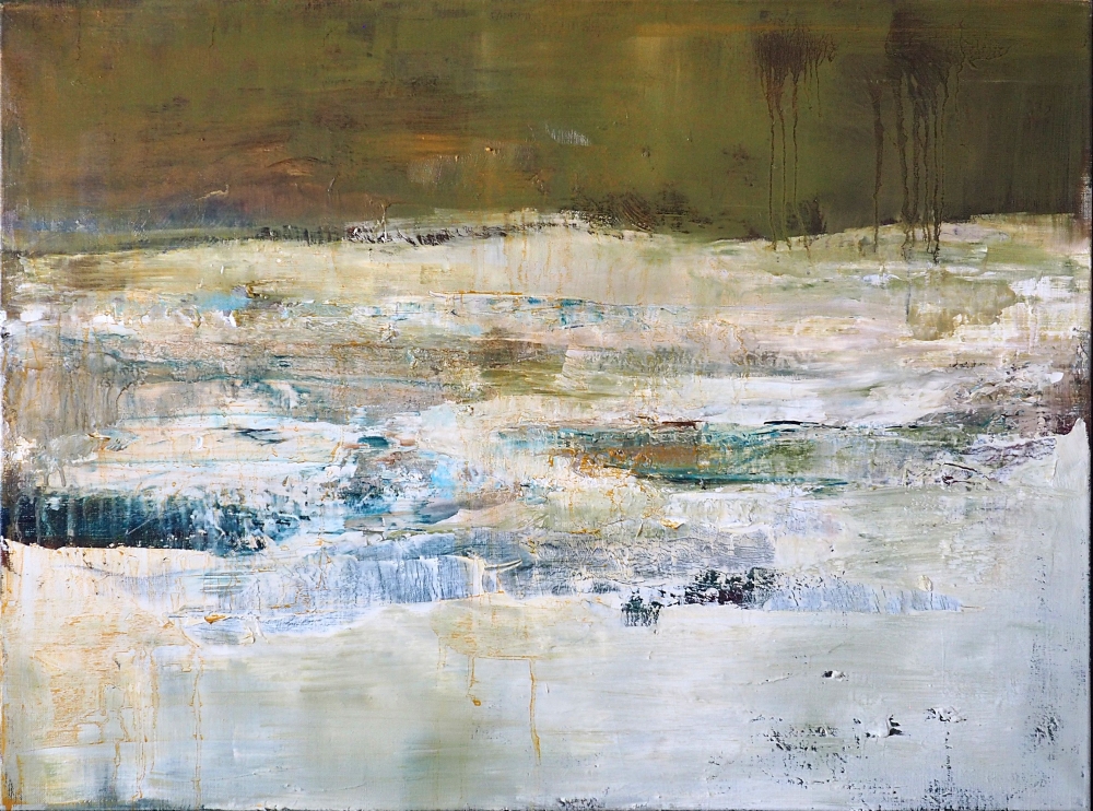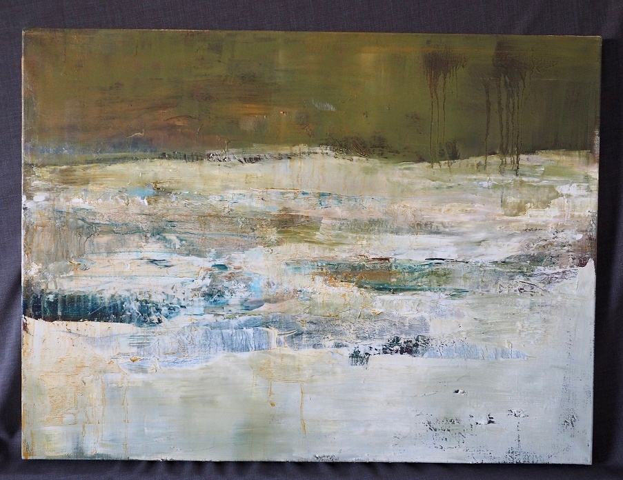 Winterlandschap half figuratief, half abstract in haar geliefde stijl. Rina Odeurs was lerares plastische opvoeding tot aan haar pensioen en autodidact hobbyschilder. Vaag zie, je contouren van het landschap met de overgang van sneeuw, naar bos en donkere lucht.
