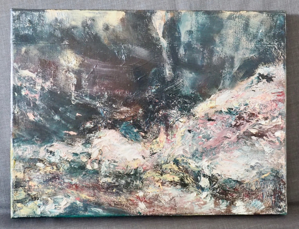 Derde werk in deze serie van Rina Odeurs, afbeelding van een ruw rots massief met een lichte voorgrond naar donker overgaand in de achtergrond. In haar eigen stijl vloeit het figuratieve steeds over naar het half abstracte.