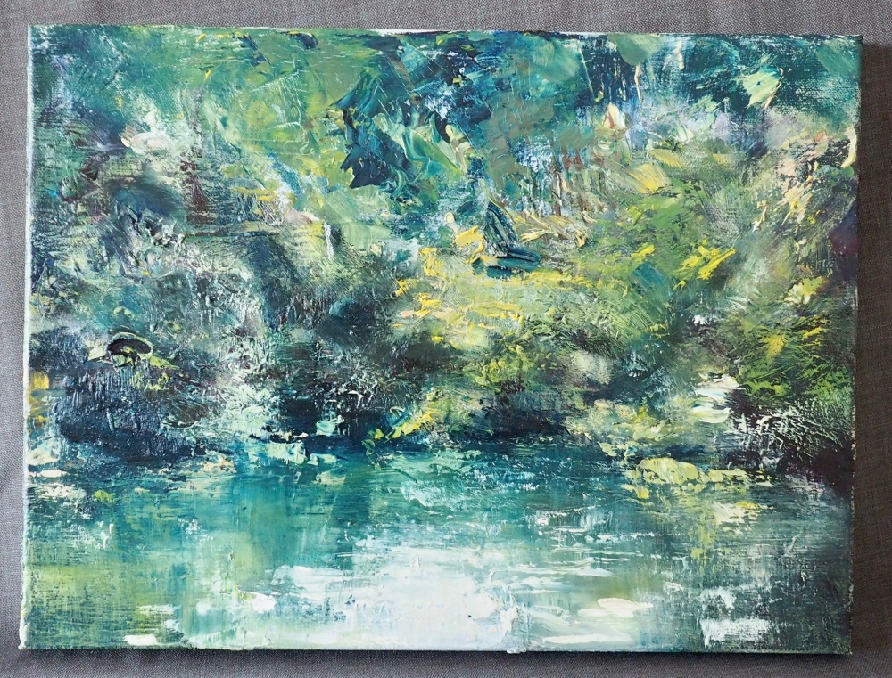Het vierde werk van Rina Odeurs in deze serie. Op de voorgrond het weerspiegelend water met de vijverplanten overgaand naar het gras en de bomen. Groenblauwe tinten wisselen af met geel licht en donker.