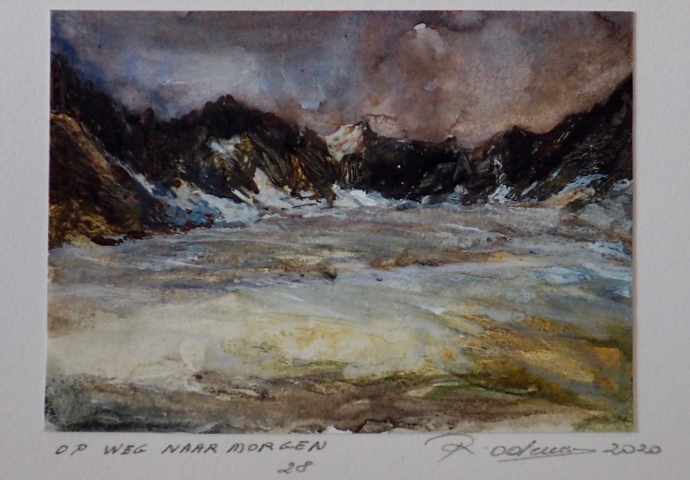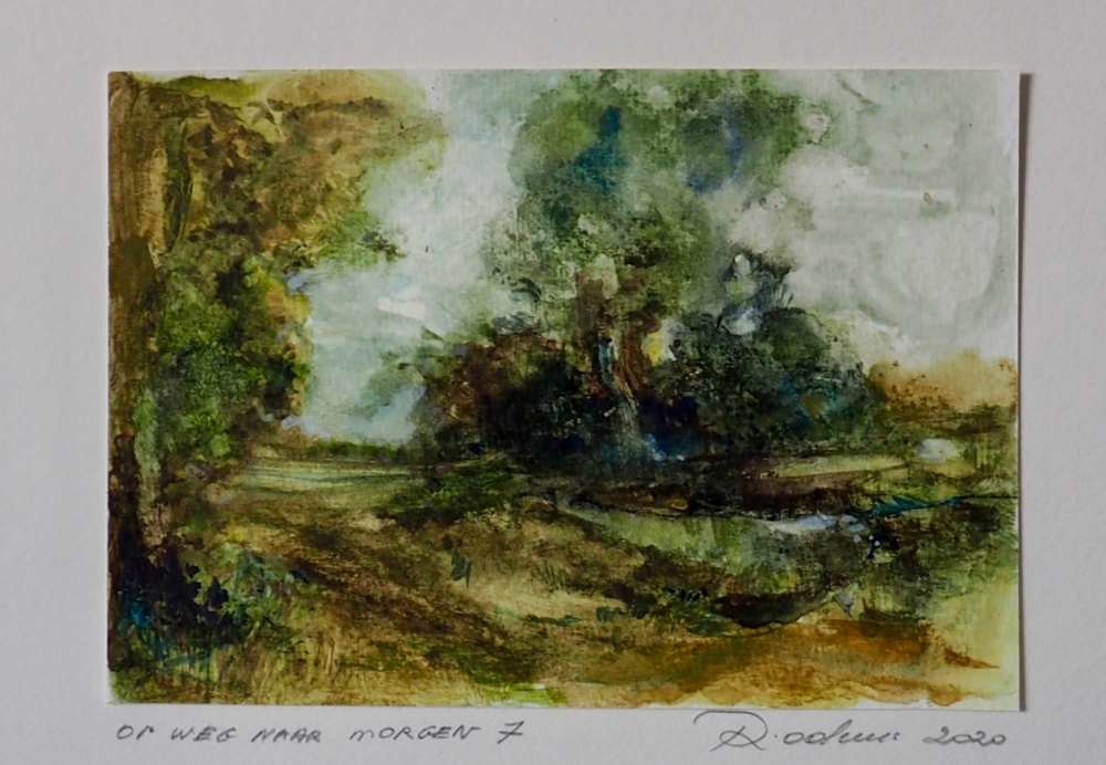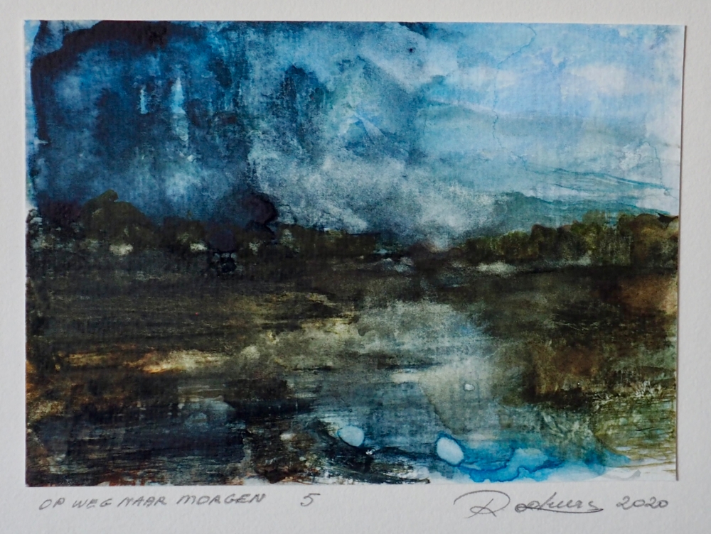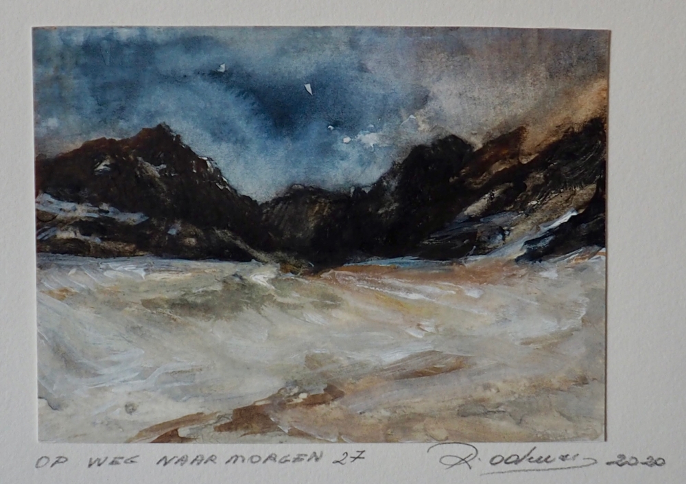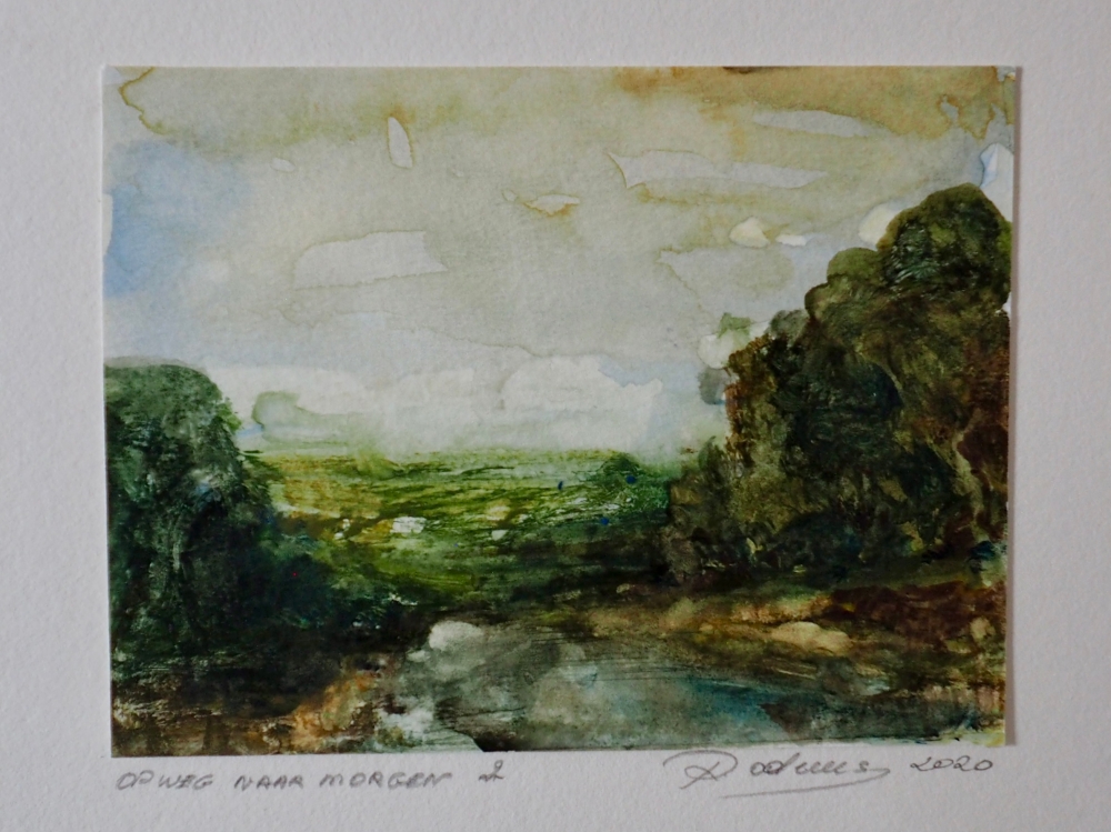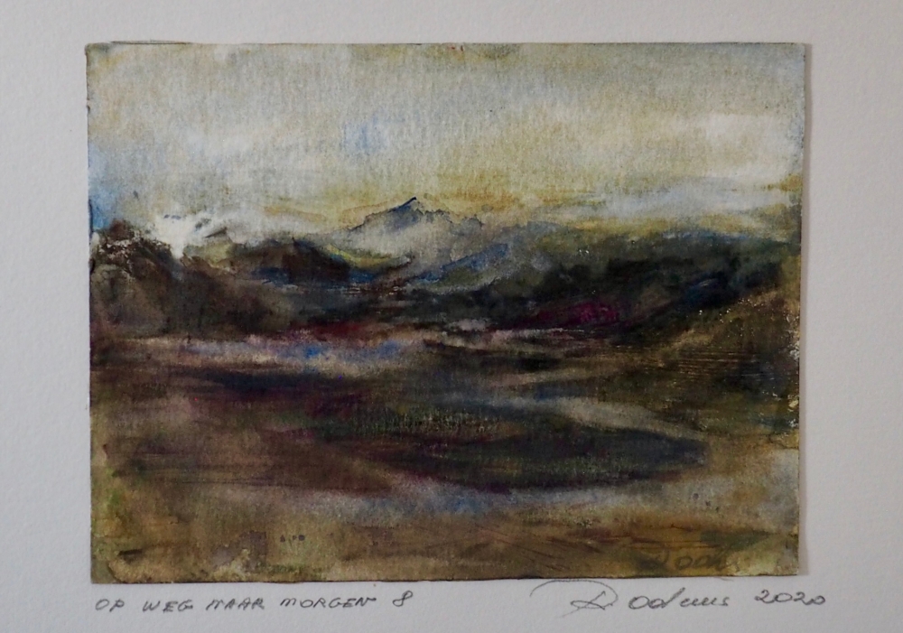 We bieden dit aan in één geheel, 6 aquarellen in de serie "Op weg naar Morgen" nrs 2 - 5 - 7 - 8 - 27 en 28. Iedere aquarel van 14 x 11 cm is gekleefd op handgeschept papier 37x27 cm in een map. Het zijn zes kleurrijke landschappen in haar eigen stijl figuratief naar abstract.