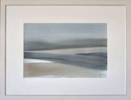 Een wereld van zand mooie aquarel van Mimi Festjens 55x36 cm onder glas in kader van 86 x 65 cm. Aangeboden door de kunstenares. Mimi haar werk overtuigt door eenvoud. Monochroom kleurgebruik met veelvuldig voorkomend blauw-grijs domineren haar palet.