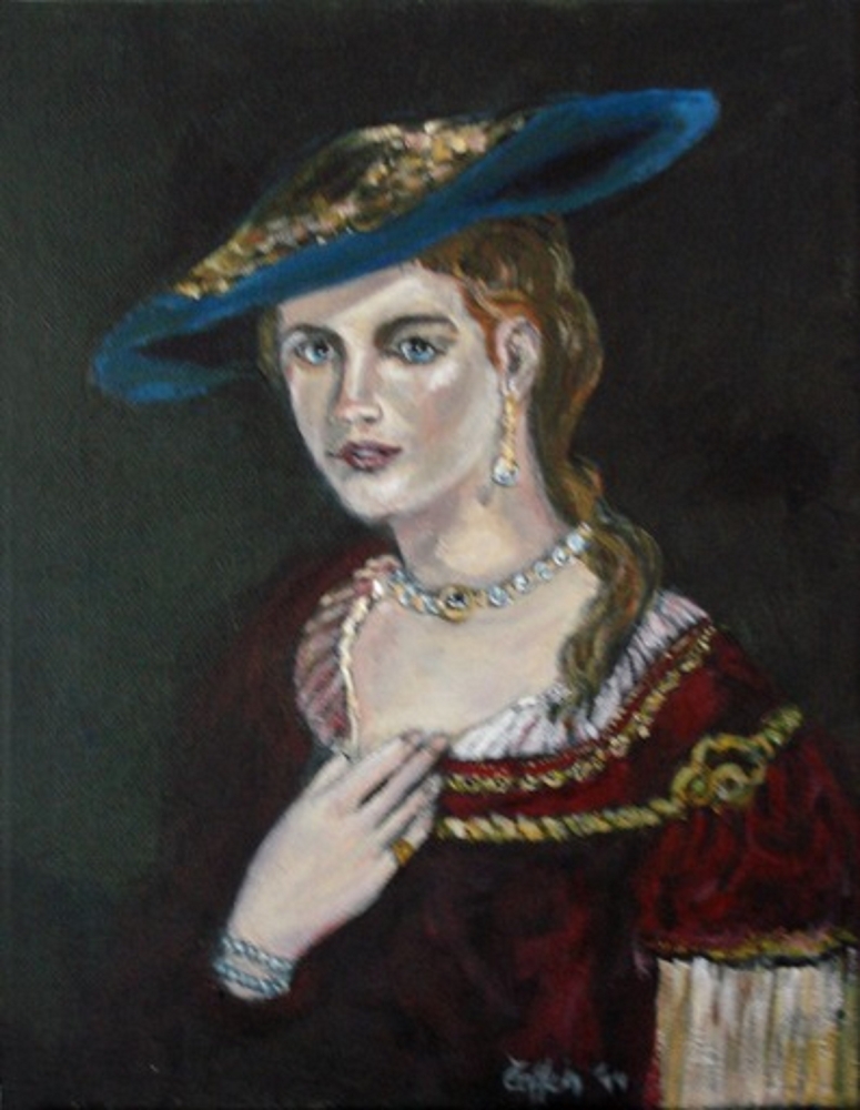 Op een donkere achtergrond de afbeelding van een jonge dame met versierde hoed met blauwe rand. Zij draagt een parelsnoer om de hals met oorbellen in dezelfde uitvoering. De dame houdt haar hand op de borst en draagt een ring aan haar pink. Betekenis hiervan een welbespraakte dame met overtuigingskracht en doorzettingsvermogen.