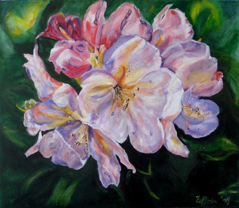 Op een groenzwarte achtergrond schildert Martine Taffein haar bloemen in volle kleurenpracht. Wit geel lila paars en rood brengen de wisselen elkaar af. De donkere achtergrond beneden gaat boven over naar lichter groen en geel.