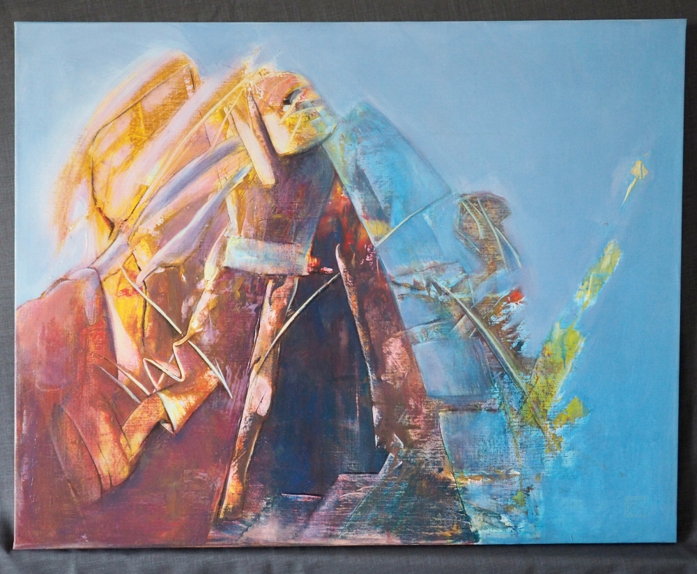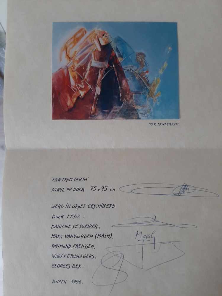 Dit werk werd geschilderd door een groep van 5 kunstenaars, en ondertekend met hun logo" FEDZ. Rood gele kleuren op een blauwe ondergrond, alsof de figuren ergens in de ruimte zweven en zich vastklampen aan de koppen van een raket. Mooi werk met een ondertekend certificaat van de vijf kunstenaars.