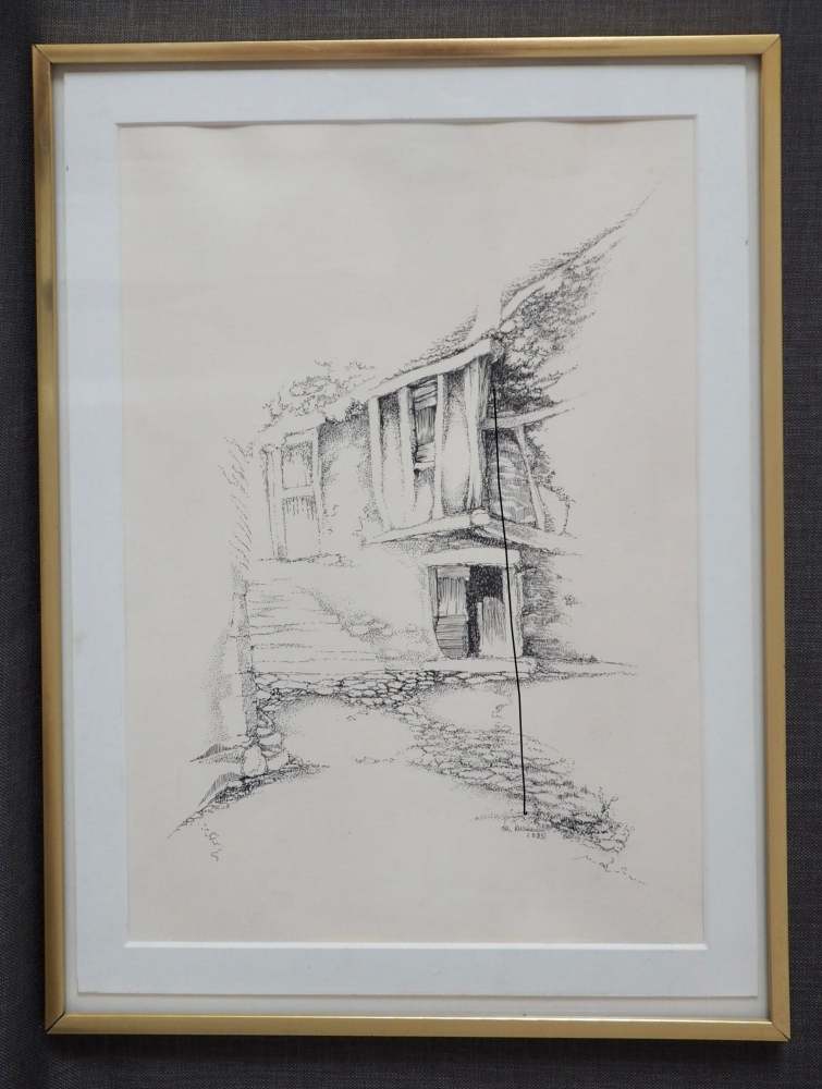 Hoevestijl Luk Kempeneers pentekening in zwarte inkt 40x30 cm in kader onder glas. Afbeelding van een oude Haspengouwse boerderij. Luc Kempeneers (1924-2006) kunstschilder en natuurgids uit Kortessem, oprichter Atelier op zolder.