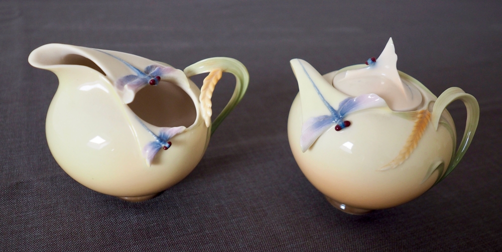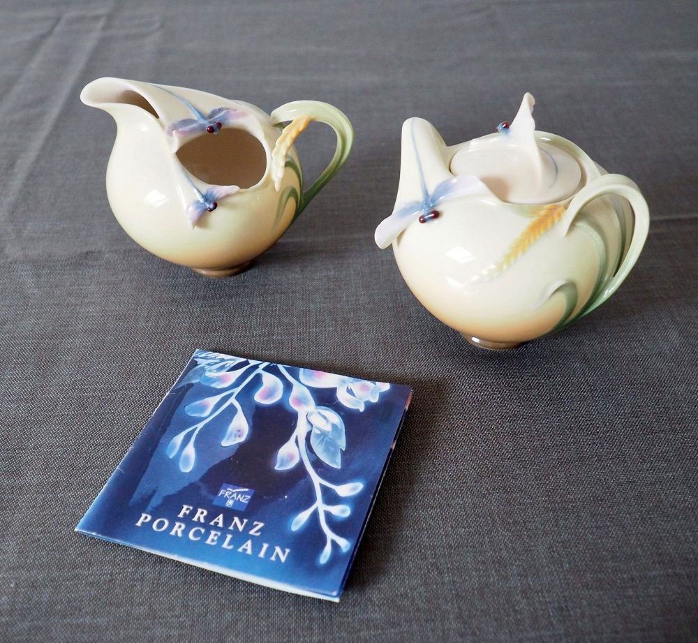 Mooi kleurrijk setje van een suiker- en melkpot uit het atelier "Franz Porcelain". Dit atelier in Schaumburg Illinois is gekend voor een succesvolle combinatie van traditioneel Chinees porselein met klassiek Art Nouveau design.